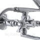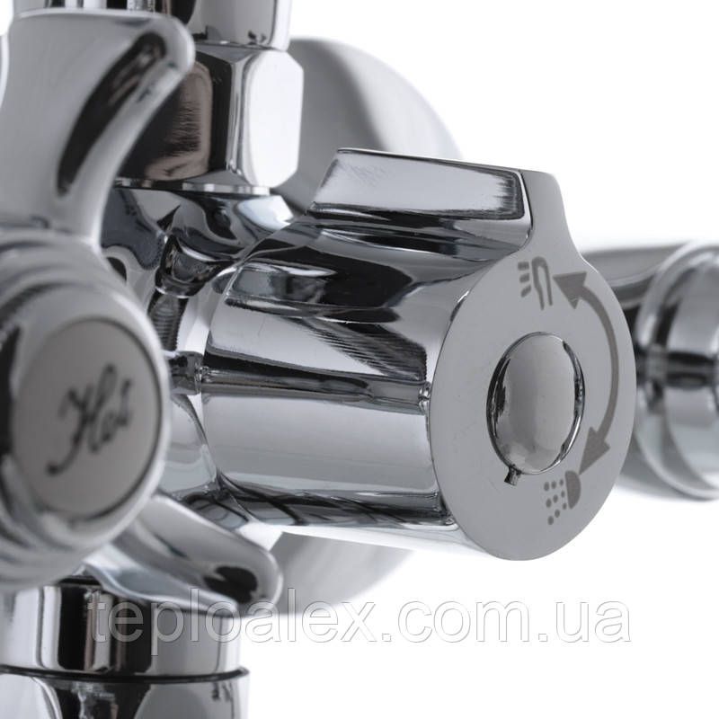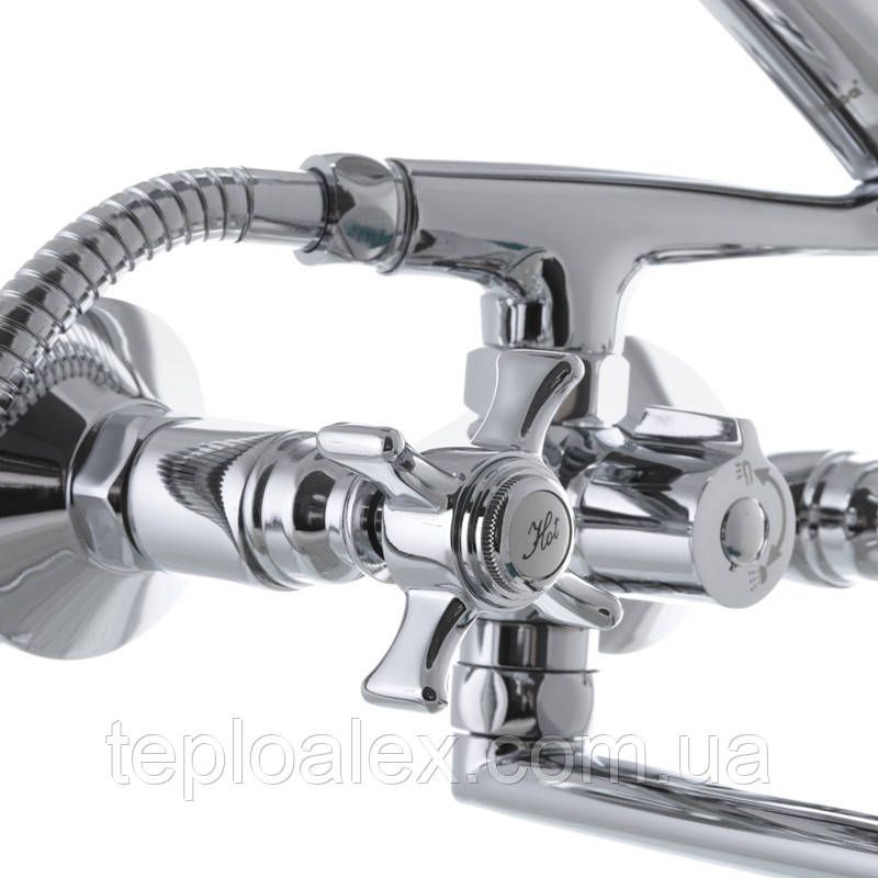 Двухручковий змішувач для ванни виготовлений з латуні категорії А. Має хромове покриття сталевого кольору і відполірований до дзеркального блиску. З технічних особливостей він виділяється зручним євро перемикачем, керамічними напівоборотними кран-буксами, а також 32 см поворотним виливом з вбудованим аератором Neoperl. Комплектація змішувача включає також 5-режимну лійку зі шлангом довжиною 1,5 метра, ексцентрики з декоративними чашками, тримач для лійки, гумові прокладки і аератор. Закріплюється змішувач на вмонтованих в стіну трубах на ексцентрики.
