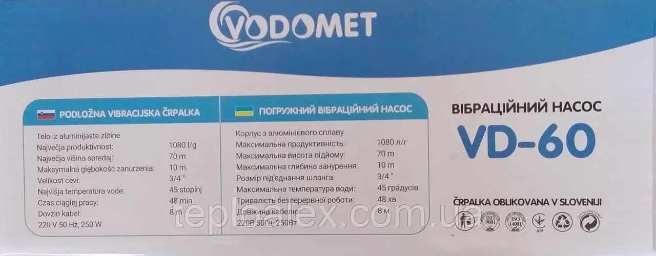 Верхнозабірний вібраційний насос для колодязя та свердловини VODOMET Словенія VD-60