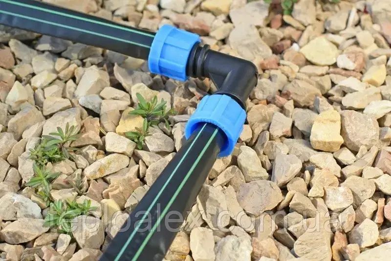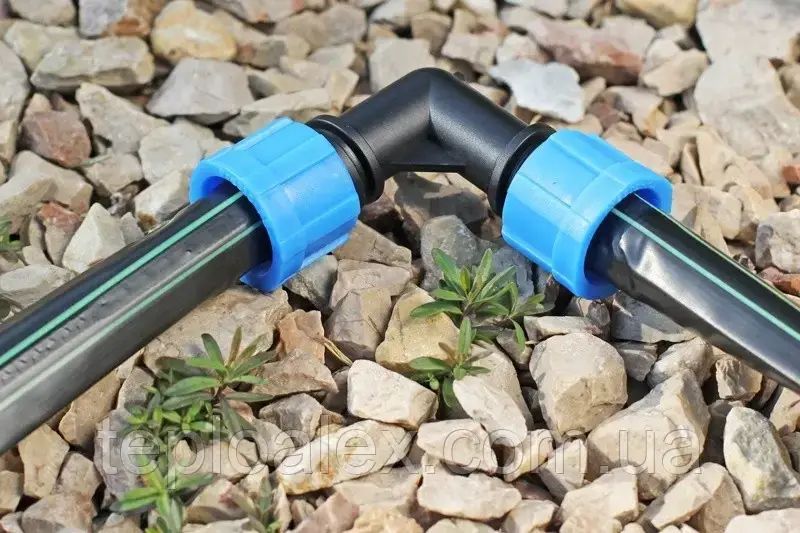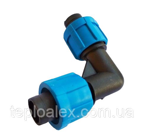 Коліно затискне використовується для уникнення перегину крапельної стрічки на ділянках, де необхідний поворот магістралі крапельного поливу. Коліно для краплинного палива дозволяє змінювати напрямок магістралі в системі краплинного палива і при цьому не вимагає витрат часу. Достатньо лише затиснути кінці стрічки за допомогою обтискної гайки, яка максимально герметична і не дає падати тиску в системі крапельного поливу.