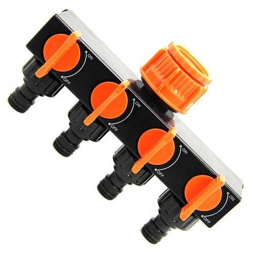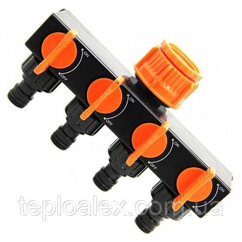 Розподілювач канальний. Планка - адаптер розподільна з чотирма запірними кранами виконана з високоякісного та удароміцного пластику ABS. Ця модель призначена для розгалуження системи поливу, якщо ви використовуєте лише одне джерело подачі води. Приєднується до різьбових кранів, труб, які мають зовнішнє різьблення 3/4" - 1". Чотири незалежні запірні крани дозволяють автономно керувати поливальними лініями, і незалежно регулювати подачу води. Легко встановлюється та не вимагає використання інструментів. Планка - адаптер з'єднується до конекторів зі шлангом по системі швидкого з'єднання.