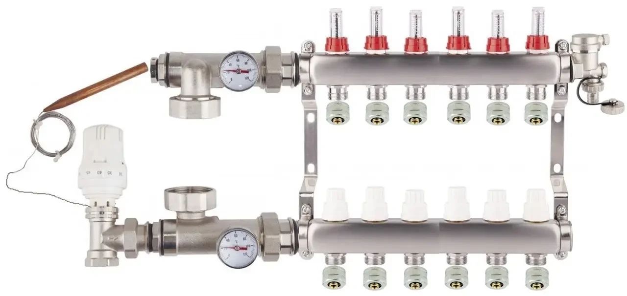 Центральним вузлом для управління і регулювання опалювальної підлогової системи є колекторна група. Вона складається з колектора, витратоміра, запірної арматури, фільтра грубої очистки, терморегулятора. Корпус пристрою виготовлений з нержавіючої сталі, стійкий до агресивного середовища. З усіма супутніми компонентами він розміщується в універсальному розподільній шафі. Трубопровід кожного з контурів радіаторного або опалення підлоги підключають до окремої пари приєднувальних штуцерів розподільника, що дає можливість регулювати витрату теплоносія, а, відповідно, і теплову потужність системи в кожному приміщенні будівлі індивідуально. Додатково вам потрібно подбати про циркуляційний насос, який прокачуватиме теплоносій. Частини колектора, що подають, оснащені регульованими витратомірами зі шкалою від 0 до 5 л/хв для балансування витрати в кожному контурі. На зворотному колекторі встановлені терморегулятори (термоклапани). З їхньою допомогою можна або в ручному режимі, або за допомогою електричних сервоприводів проводити повне або часткове перекриття контурів теплої водяної підлоги. В асортименті колектор у зборі на 2-12 виходів з однією зливною групою. Переваги чудова герметичність і здатність тримати великий тиск та температуру 100 % контроль якості продукції строк експлуатації більше 10 років легкість монтажу можливість самостійно регулювати витрати теплоносія можливість встановлення сервоприводу високоякісні комплектуючі Колектор для теплої підлоги складається: Дві балки з витратомірами і регулювальними вентилями вузол підключення насоса (насос в комплекті не йде) термоголовка з виносним датчиком зливний кран повітровідвідник автоматичний термометр на подачу термометр на обратку