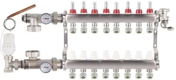 Центральним вузлом для управління і регулювання опалювальної підлогової системи є колекторна група. Вона складається з колектора, витратоміра, запірної арматури, фільтра грубої очистки, терморегулятора. Корпус пристрою виготовлений з нержавіючої сталі, стійкий до агресивного середовища. З усіма супутніми компонентами він розміщується в універсальному розподільній шафі. Трубопровід кожного з контурів радіаторного або опалення підлоги підключають до окремої пари приєднувальних штуцерів розподільника, що дає можливість регулювати витрату теплоносія, а, відповідно, і теплову потужність системи в кожному приміщенні будівлі індивідуально. Додатково вам потрібно подбати про циркуляційний насос, який прокачуватиме теплоносій. Частини колектора, що подають, оснащені регульованими витратомірами зі шкалою від 0 до 5 л/хв для балансування витрати в кожному контурі. На зворотному колекторі встановлені терморегулятори (термоклапани). З їхньою допомогою можна або в ручному режимі, або за допомогою електричних сервоприводів проводити повне або часткове перекриття контурів теплої водяної підлоги. В асортименті колектор у зборі на 2-12 виходів з однією зливною групою. Переваги чудова герметичність і здатність тримати великий тиск та температуру 100 % контроль якості продукції строк експлуатації більше 10 років легкість монтажу можливість самостійно регулювати витрати теплоносія можливість встановлення сервоприводу високоякісні комплектуючі Колектор для теплої підлоги складається: Дві балки з витратомірами і регулювальними вентилями вузол підключення насоса (насос в комплекті не йде) термоголовка з виносним датчиком зливний кран повітровідвідник автоматичний термометр на подачу термометр на обратку