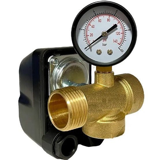 Набір п'ятірник манометр реле тиску PM/5G РЕЛЕ ТИСКУ ДЛЯ ВОДЯНИХ СИСТЕМ Ці реле тиску використовуються в водяних станціях для автоматичного регулювання тиску. Забезпечують автоматичне увімкнення та вимкнення електричного насоса відповідно до налаштованих значень тиску. Електричні контакти: нормально замкнуті, мідні, з покриттям Ag-Ni. Клеми з чотирма болтами М4 і два притискні гвинти, що регулюють тиск 8Х8 мм. Гідравлічне з'єднання 1⁄4" "мама" "накидна гайка" Стандартний клас захисту IP 44. Максимальна температура довкілля: 55°C. Високоміцні кабельні клеми. Діапазон тиску 1-5 бар Заводське настроювання 1,4-3 бар Мінімальне значення різниці 0,6 бара Максимальне значення різниці 5 барів Номінальний струм 16 А