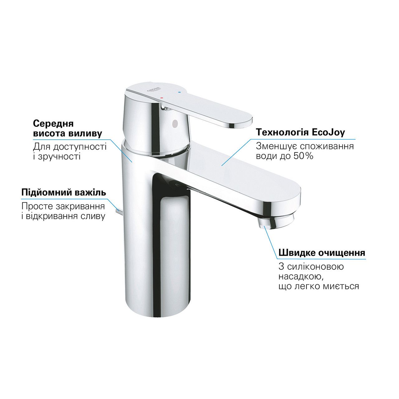 Змішувач для раковини Grohe QuickFix Get M-Size 23454000 виготовлений із високоякісної харчової латуні, стійкої до впливу корозії, ударів і тріщин. Глянсове хромоване покриття не тільки підвищує довговічність змішувача, але й надає йому оригінального зовнішнього вигляду. Інтенсивність водного потоку та температура регулюються за допомогою важільного переміщення. Під'єднання води відбувається через гнучкі шланги з діаметром під'єднання 3/8". Завдяки системі швидкого монтажу GROHE QuickFix час встановлення скорочується до 40%. До комплекту входить зливний гарнітур 1 1/4".