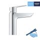 Змішувач для раковини Grohe QuickFix Start M-Size 24204002 виготовлений із високоякісної харчової латуні, стійкої до впливу корозії, ударів і тріщин. Глянсове хромоване покриття не тільки підвищує довговічність змішувача, але й надає йому оригінального зовнішнього вигляду. Інтенсивність водного потоку та температура регулюються за допомогою важільного переміщення. Під'єднання води відбувається через гнучкі шланги з діаметром під'єднання 3/8". Завдяки системі швидкого монтажу GROHE QuickFix час встановлення скорочується до 40%. До комплекту входить зливний гарнітур 1 1/4".