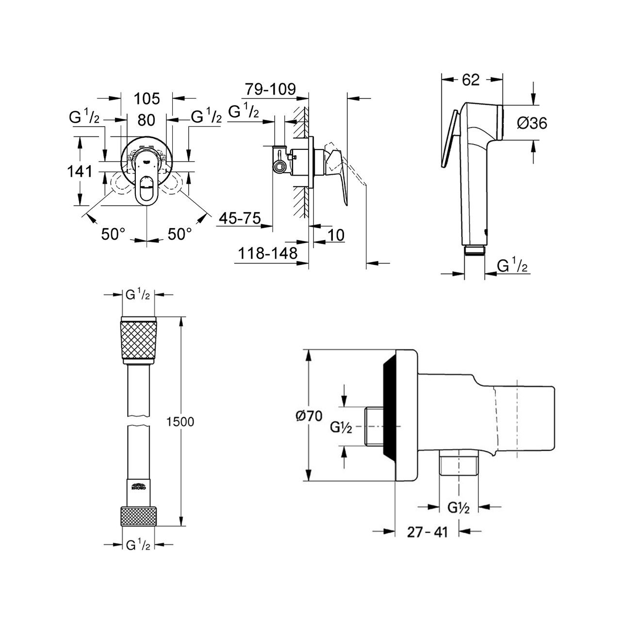Готове рішення для пристрою гігієнічного душу з німецькою якістю Grohe. Комплект містить усе необхідне для прихованого монтажу: ручну лійку, шланг, настінне під'єднання та змішувач. Ідеально підходить для сучасної ванної кімнати — компактно, гігієнічно та стильно.