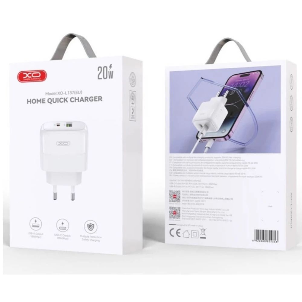 Мережевий зарядний пристрій XO L137, 1Type-C/1USB, PD/QC 20W, Білий
