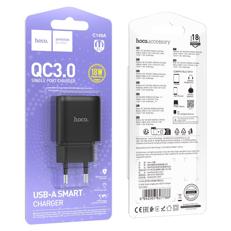 Мережевий зарядний пристрій Hoco C140A, 1USB, QC, 18W, Чорний
