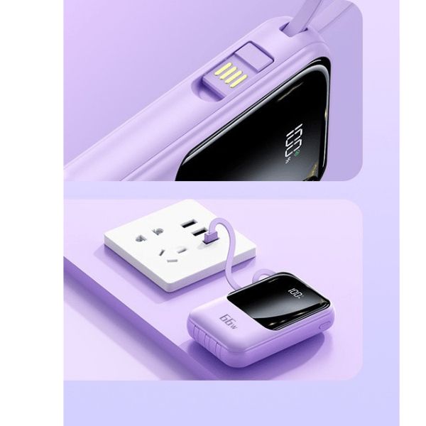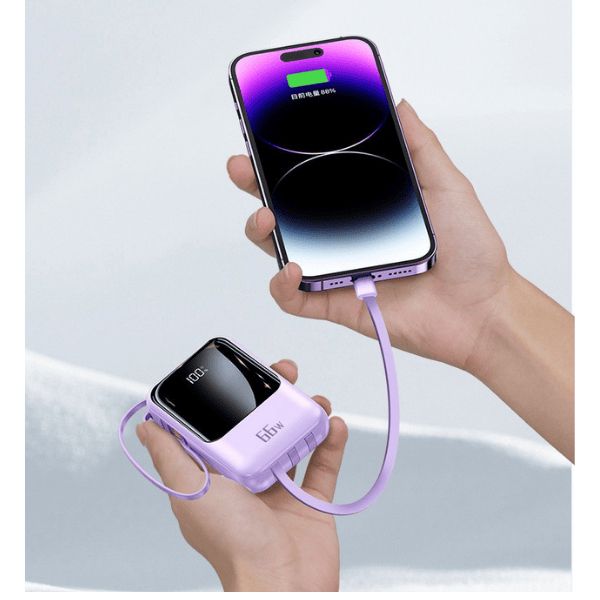 Ємність 20000 mAh і потужність до 66W дозволяють заряджати смартфони, планшети, навушники та інші гаджети максимально ефективно. Завдяки вбудованим кабелям (USB-C, Lightning, Micro-USB та USB-A) вам не потрібно носити із собою додаткові дроти.