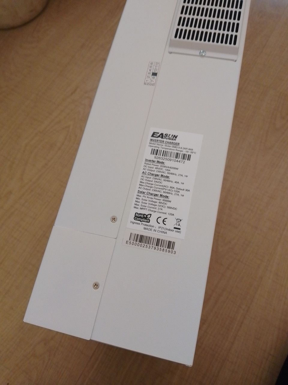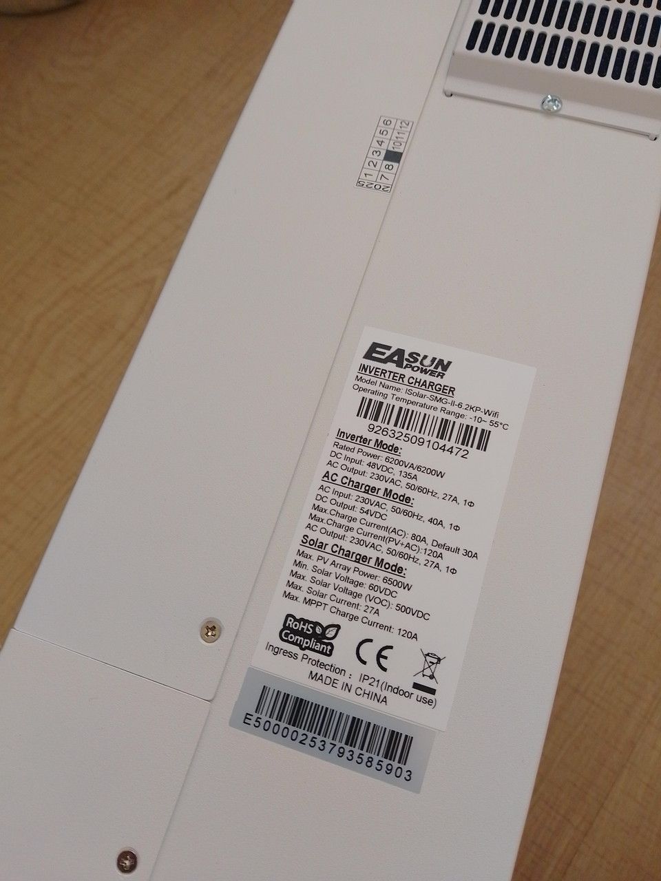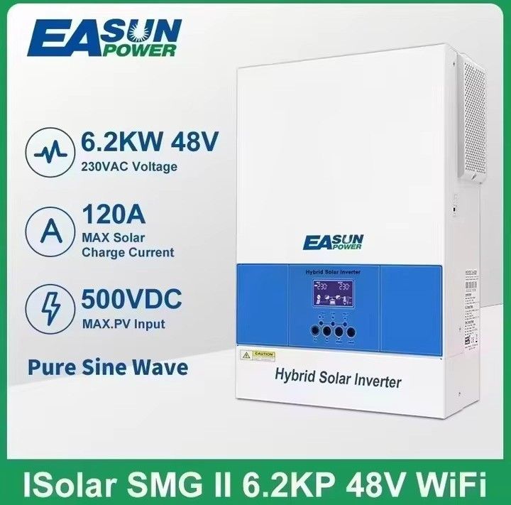 Гібридний інвертор має потужність до 6200 ватів і вбудований контролер МРРТ на струм до 120 А. Він може працювати з будь-якими типами акумуляторних батарей із напругою 48 В.