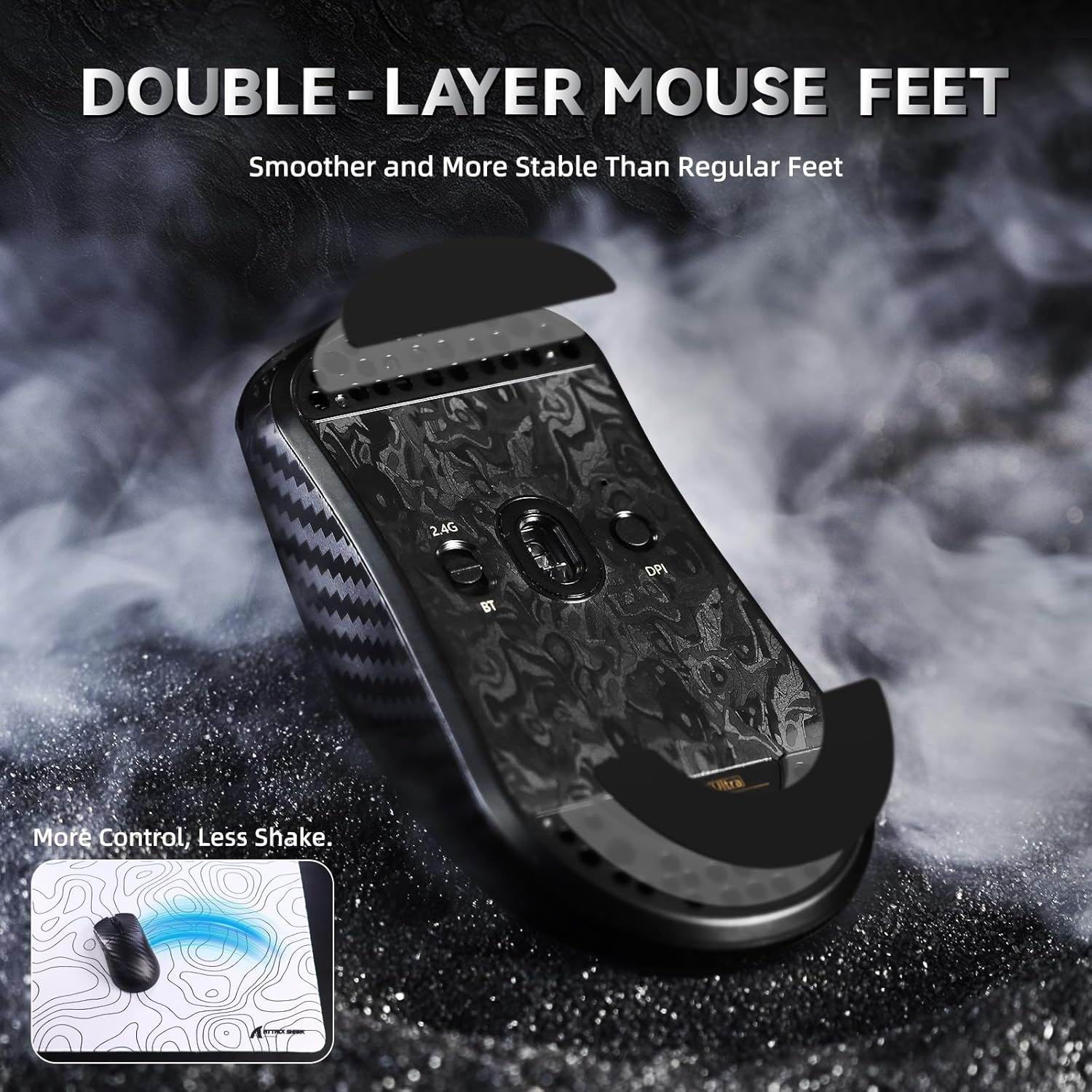Карбонова оболонка | Надлегка, 49 г Відчуйте R11 ULTRA – бездротову мишу, виготовлену з вуглецевого композиту для неперевершеної міцності та надзвичайно легкої спритності. Вага всього 49 грамів – на 22% легша за G Pro X та на 14% легша за V4 Pro – вона легко ковзає для точного керування в RPG, MMO, FPS, MOBA, Battle Royale та будь-якій швидкій битві. Датчик PAW3950MAX | Мікроконтролер Nordic 52840 Подолайте всі межі з датчиком PAW3950MAX – 42 000 DPI для високої точності, 750 IPS для неперевершеної швидкості та прискорення 50G, щоб встигати за кожним вашим рухом. Завдяки мікроконтролеру Nordic 52840, вона забезпечує блискавично швидкий відгук та бездоганну бездротову стабільність. Створена для перемоги, створена для вас. Частота опитування 8000 Гц | Статична частота сканування 20000 кадрів/с Розкрийте весь потенціал вашого сенсора: увімкнений режим «Полювання на акулу» частота статичного сканування зростає до 20 000 кадрів/с, а частота опитування 8000 Гц забезпечує миттєве відстеження кожного руху та вражаючу точність кожного клацання — ідеально підходить для високошвидкісних змагальних ігор. Нанометалеве льодове покриття | Двошарові ніжки миші Залишайтеся прохолодними під тиском завдяки нанометалевому льодовому покриттю, яке забезпечує комфорт вашої руки під час інтенсивної гри. У поєднанні з двошаровими ніжками миші воно забезпечує надзвичайно плавне ковзання без тертя для точних та блискавично швидких рухів. Веб-керування та програмне забезпечення | Оптичні мікроперемикачі Налаштуйте мишу на свій смак — через веб-сайт або за допомогою завантажуваного програмного забезпечення. Створені для довговічності, оптичні мікроперемикачі витримують понад 70 мільйонів кліків, а енкодер F-SWITCH забезпечує 2 мільйони циклів бездоганної роботи.