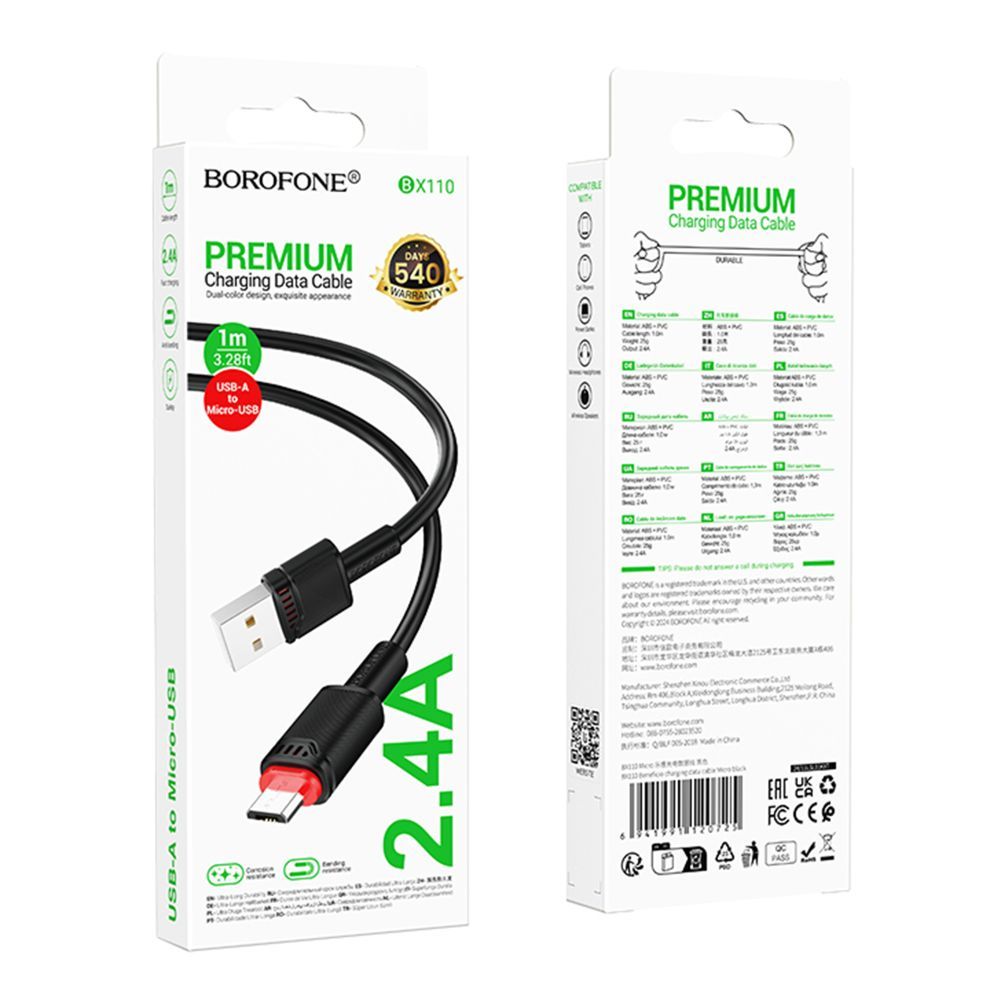 Кабель Borofone BX110 USB to MicroUSB — це практичний та надійний аксесуар, створений для швидкої зарядки та стабільної передачі даних пристроїв з роз'ємом MicroUSB. Модель поєднує в собі сучасний дизайн, міцну конструкцію та високі електричні характеристики, що робить її чудовим вибором для повсякденного використання вдома, в офісі чи в дорозі.