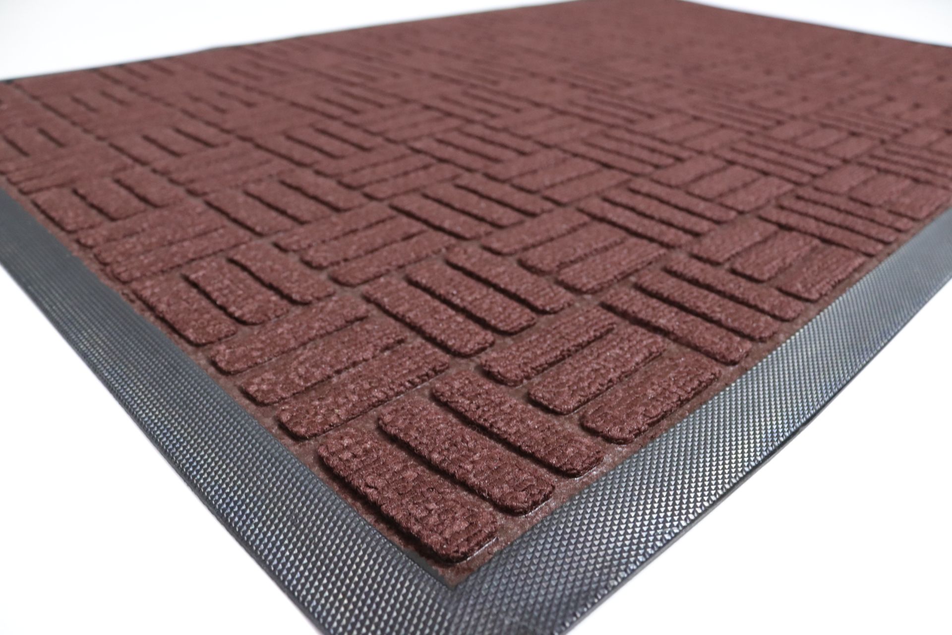 Верх килимка виготовлений з поліамідного волокна, яке ефективно затримує пил і сміття з взуття. Гумова основа забезпечує надійне зчеплення з підлогою та запобігає ковзанню, а підвищений борт по периметру утримує вологу та бруд всередині килимка.