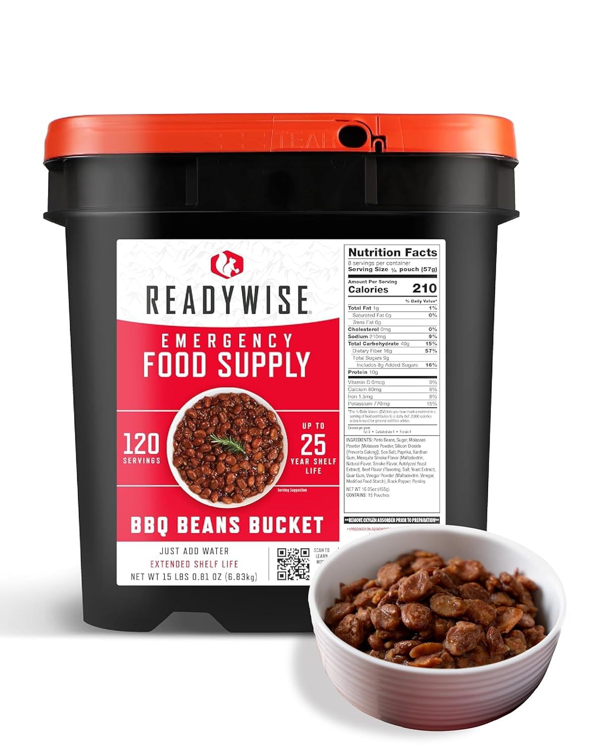Сублімування квасоля барбекю Readywise у пластиковому відрі - це готова страва з квасолі, яка була приготовлена як барбекю і потім сублімована. Після її відновлення (регідрації) її можна відразу вживати у іжу.