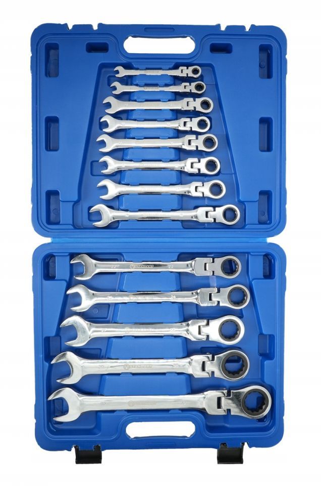 Професійний набір з 13 комбінованих ключів з тріскачкою та шарніром у міцному кейсі. Кожен ключ оснащений рухомою накидною головкою з храповим механізмом (тріскачкою), що дозволяє зручно і швидко працювати навіть у важкодоступних місцях. Шарнірні головки забезпечують гнучкість у роботі та кращий доступ в обмеженому просторі.