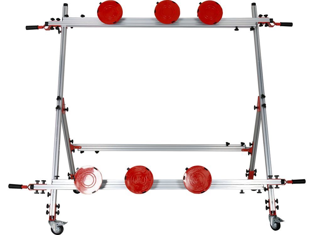 Міцна та універсальна транспортна ручка призначена для безпечного та стабільного переміщення з листами великого формату як при транспортуванні, так і при розміщенні матеріалу на місці монтажу. Конструкція системи базується на двох напрямних з алюмінієвого сплаву, що висуваються в діапазоні 160-360 см, та шести міцних вакуумних присосках, точки кріплення яких можна точно регулювати в залежності від форми матеріалу, що забезпечує відмінну несучу здатність та надійність на робочому місці.