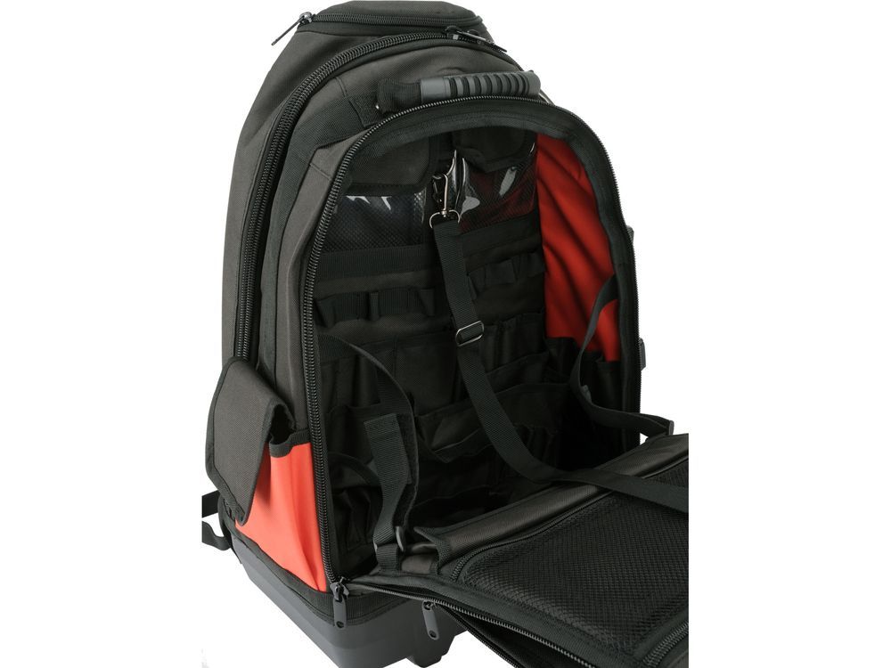 Інструментальний рюкзак об'ємом 48 літрів з посиленим водонепроникним дном поєднує функціональність класичного рюкзака з мобільністю транспортної сумки, що робить його придатним як для польових робіт, так і для організації інструментів у майстерні.