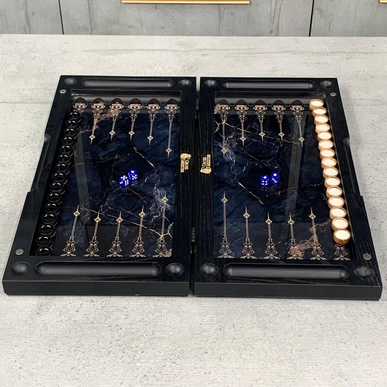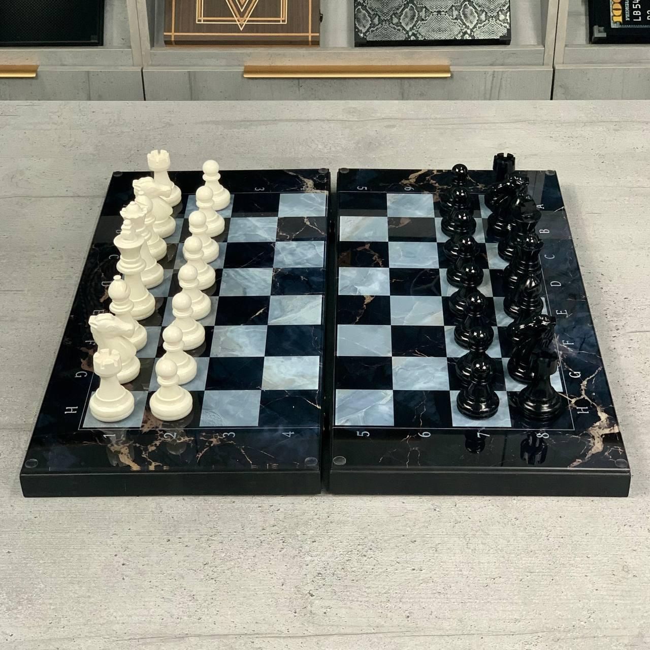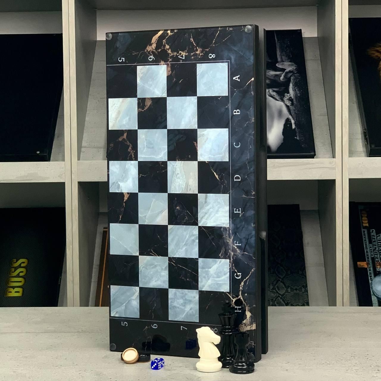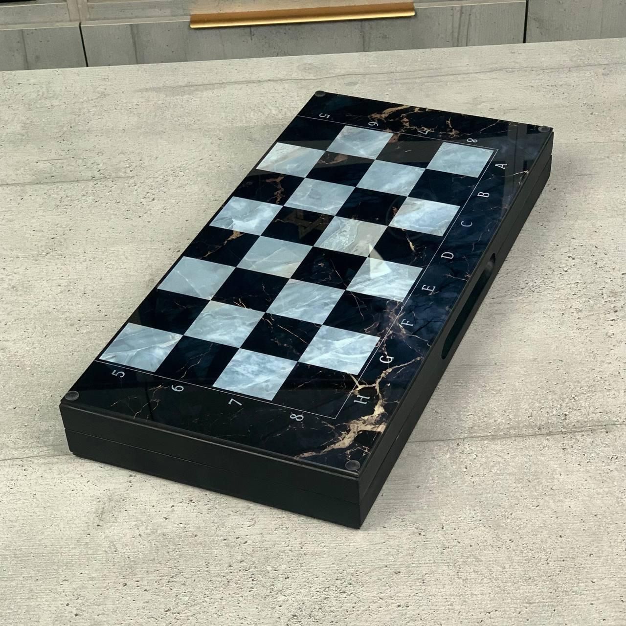 Шахи та нарди 3в1 зі скляним полем та мармуровим дизайном
