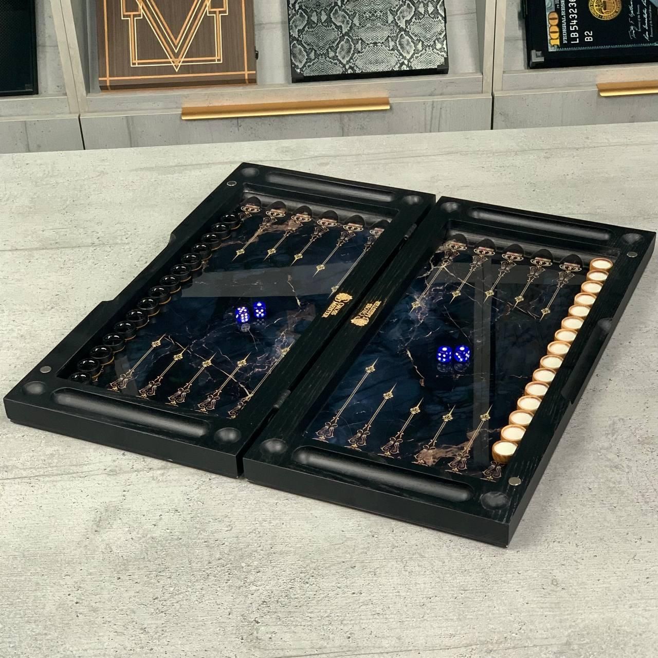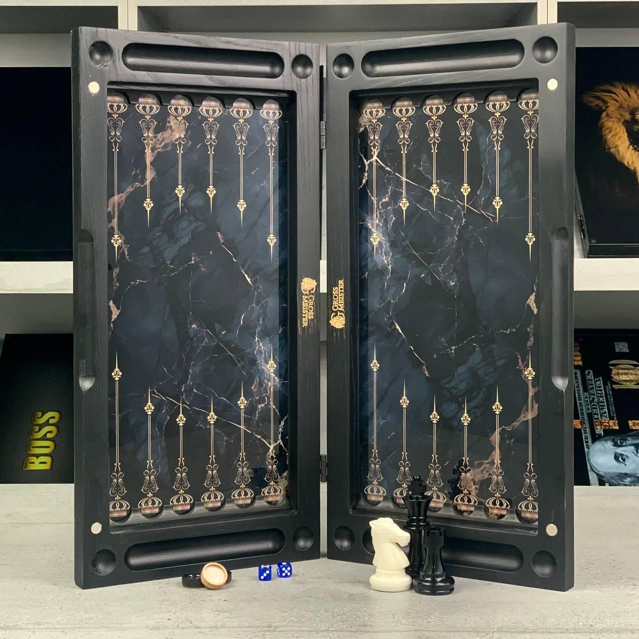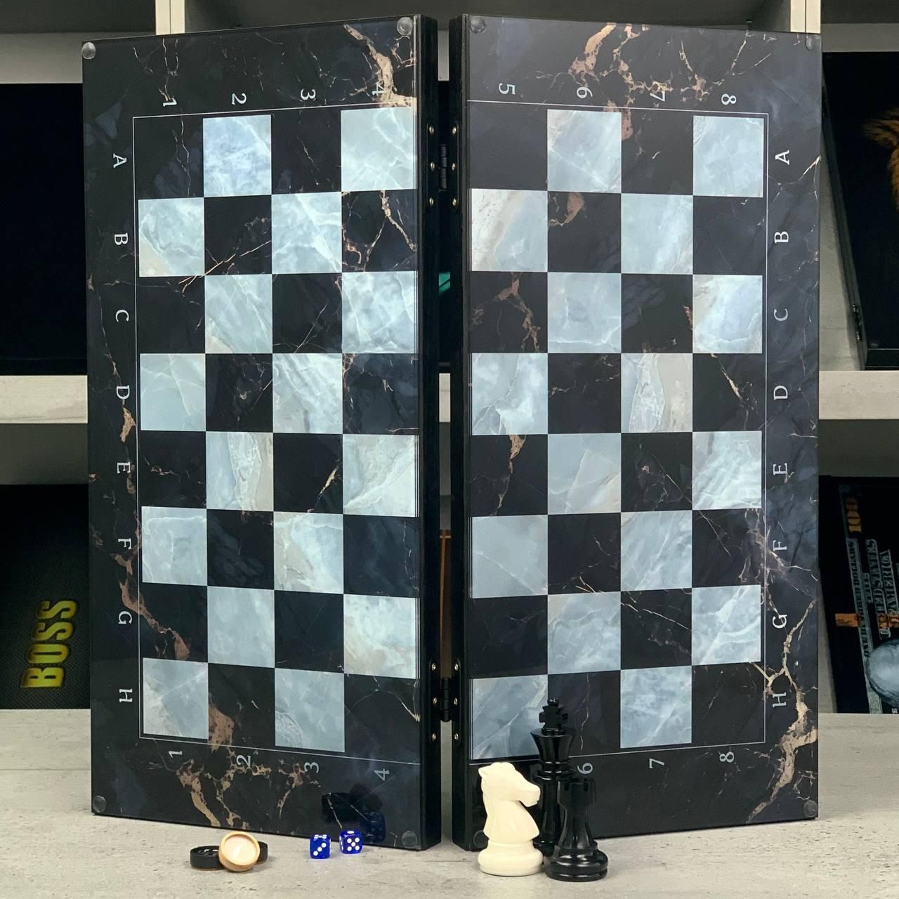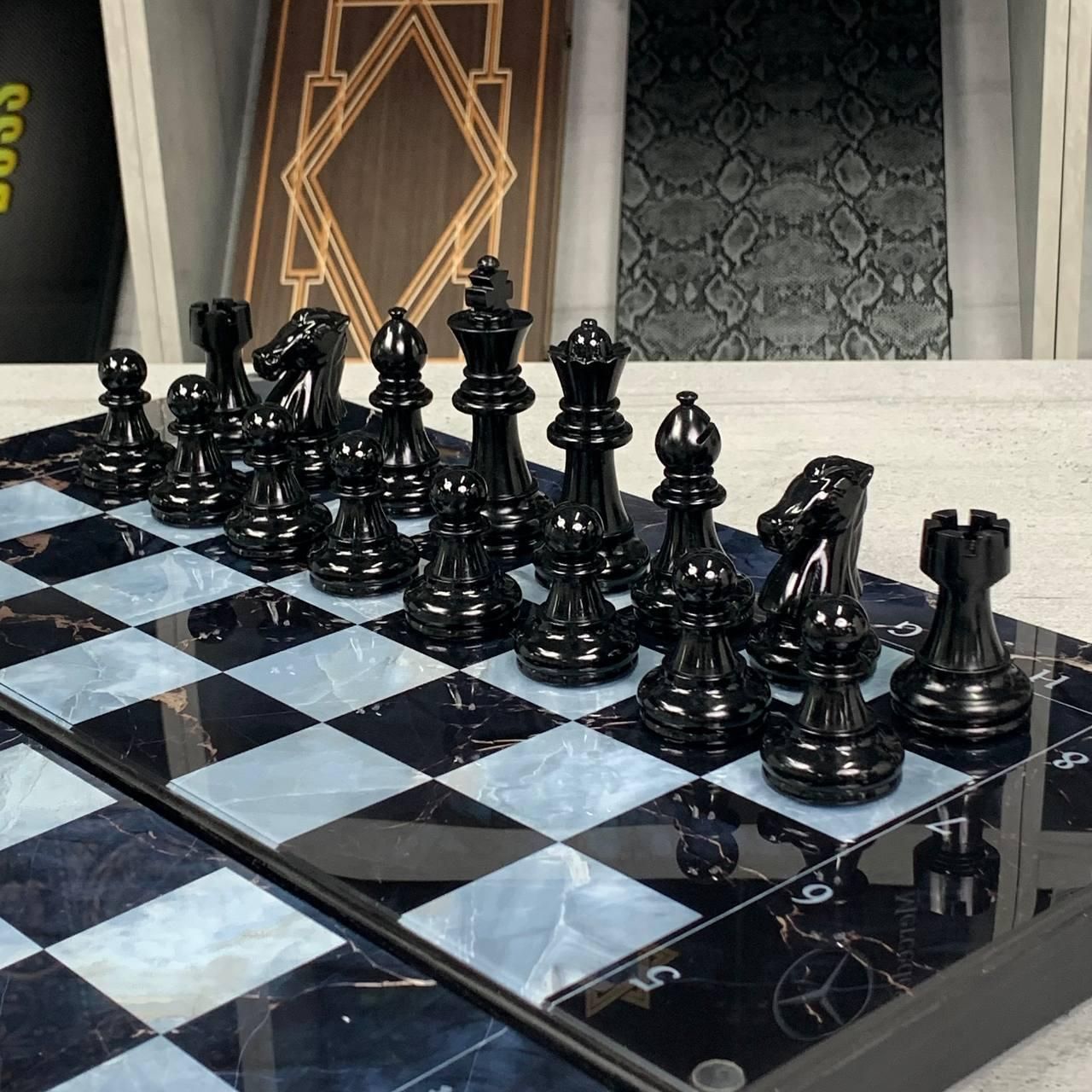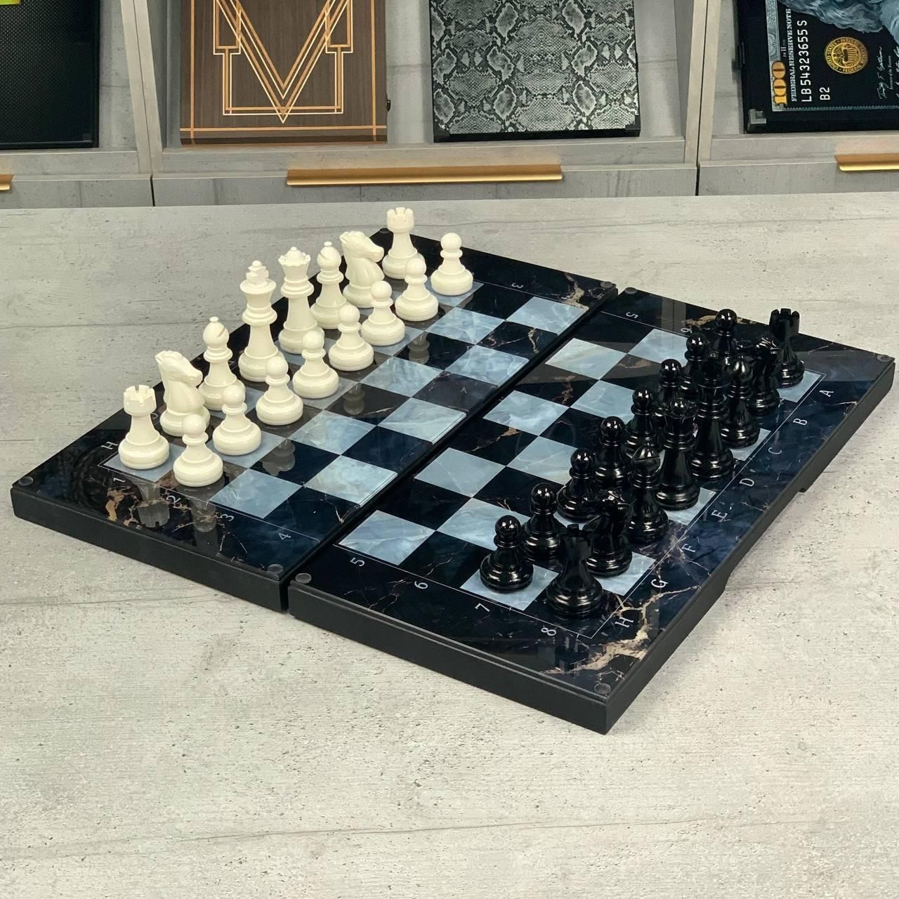 Шахи та нарди 3в1 зі скляним полем та мармуровим дизайном