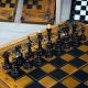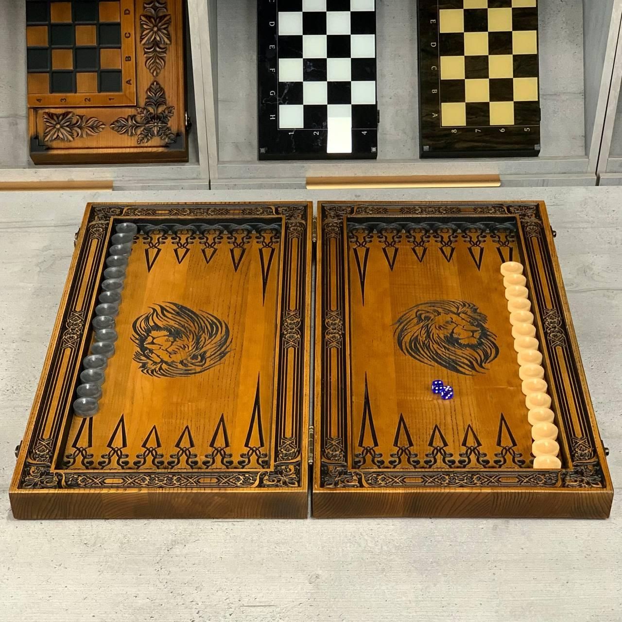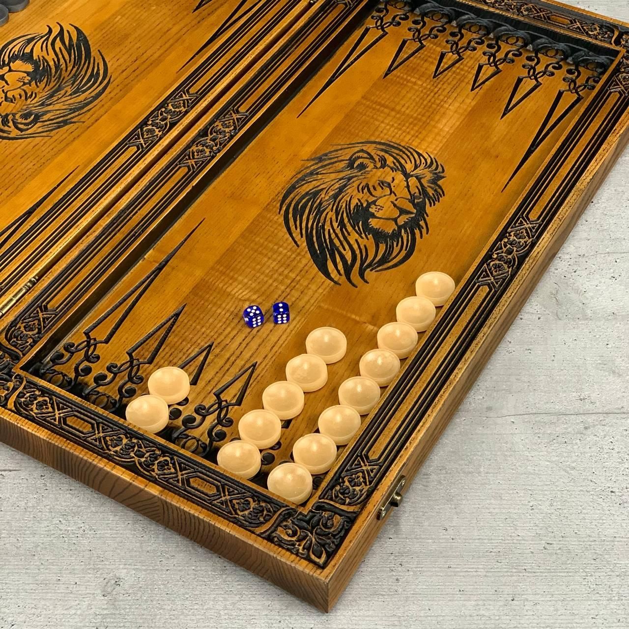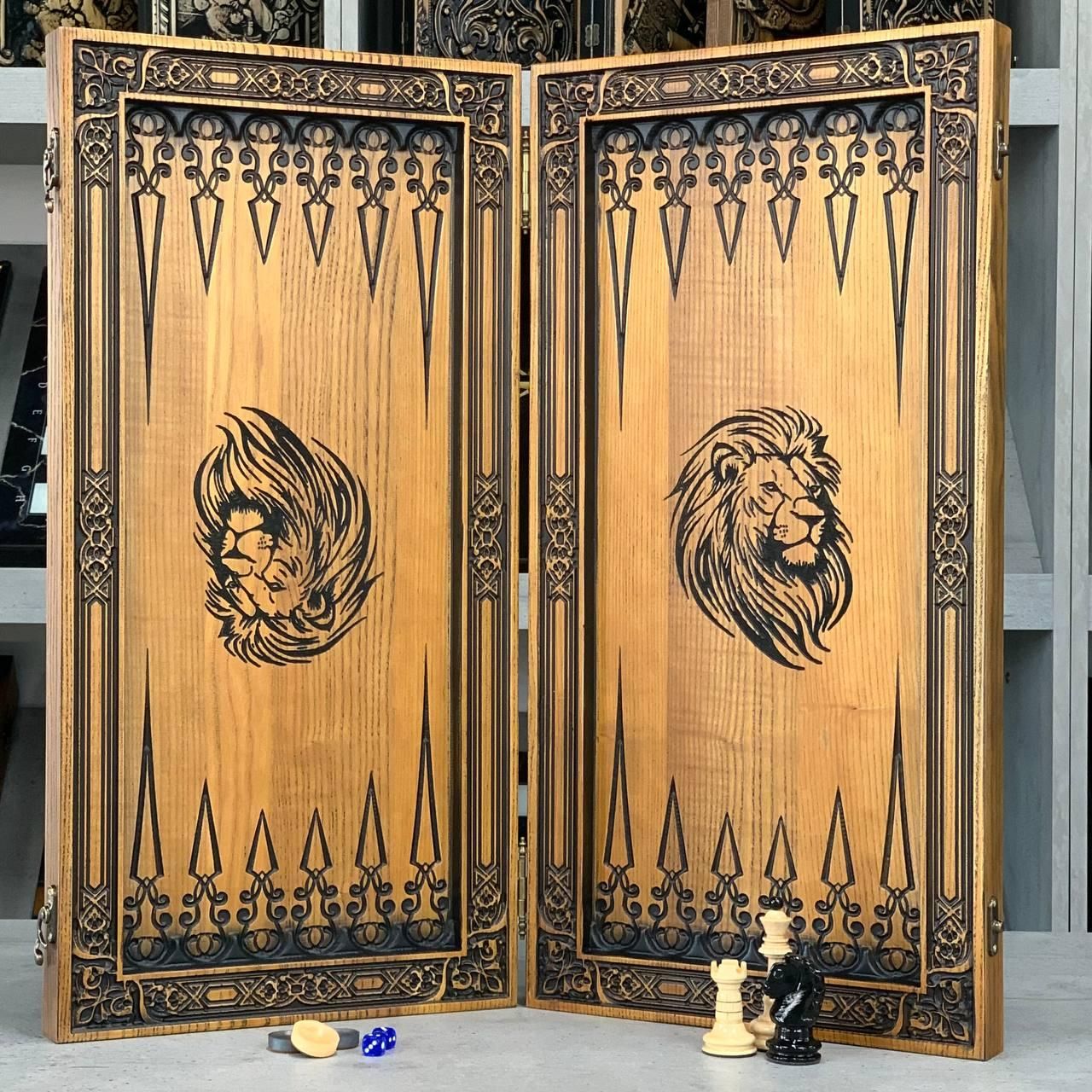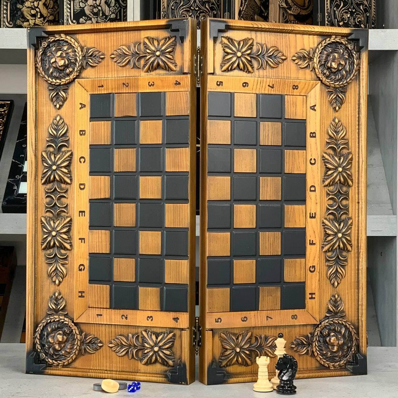 Дерев'яні шахи, різьблений набір з левом із ясеня, 64х32 см, арт.191106