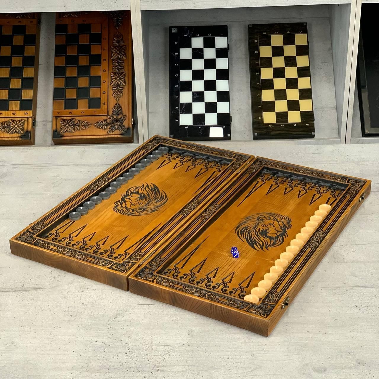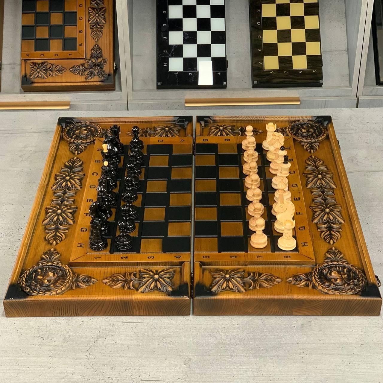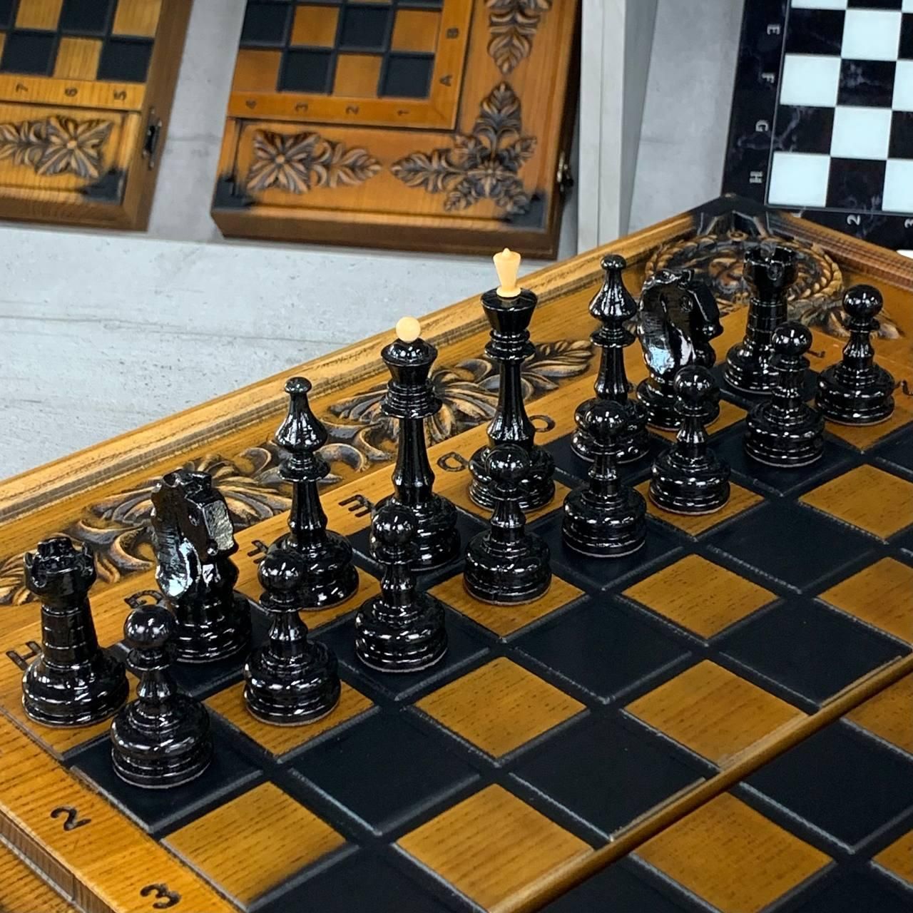 Нарди, шахи та шашки з дерева — різьблений набір з левом із ясеня Цей елітний набір шахи, шашки та нарди 3 в 1 виготовлений із натурального ясеня та прикрашений ручним різьбленням. На зовнішній частині майстерно вирізьблений образ лева, що символізує силу та велич, а внутрішнє оформлення з різьбленим левом додає набору неповторного характеру. Набір дозволяє грати у шахи, шашки, довгі нарди та короткі нарди, поєднуючи в собі практичність і вишуканість. Вага майже 7 кг та великі розміри (64×64 см у розкладеному вигляді) підкреслюють його статусність і надійність. Це не просто настільна гра, а витвір мистецтва, що стане справжньою окрасою вашої колекції чи подарунком преміум-класу. Особливості Цей набір виготовлений з якісного масиву ясеня, відомого своєю міцністю та довговічністю. Ручне різьблення з образом лева робить набір ексклюзивним і неповторним. Універсальність: можливість грати у шахи, шашки та нарди (короткі й довгі). Великий розмір і солідна вага створюють особливу атмосферу гри та підкреслюють престиж. Фішки зі смоли приємні на дотик, діаметром 30 мм, зручні для гри. Детальний опис Коричнево-бежеве оформлення підкреслює натуральну красу дерева. Фігури для шахів виконані в класичному стилі та гармонійно поєднуються з різьбленим полем. Комплектація містить усе необхідне: фішки, шахові фігури, кубики. Набір чудово підійде як для колекції, так і для подарунка. Технічні характеристики Параметр Значення Гра Шахи, шашки, нарди (довгі та короткі) Зовнішнє оформлення Різьблення по дереву (елементи лева) Внутрішнє оформлення Різьблення по дереву (лев) Розмір у складеному вигляді 64×32 см Розмір у розкладеному вигляді 64×64 см Матеріал Дерево (ясень) Колір Коричневий, бежевий Вага 8 кг Фішки Смола Діаметр фішок 30 мм Кубики Пластик, 12 мм Комплектація Шахи/шашки/нарди (1 шт), фігури, фішки (15 світлих + 15 темних), кубики (2 шт) Чому варто купити? Це класичні різьблені нарди, шахи та шашки з дерева, які поєднують у собі красу, практичність та ексклюзивність. Вони стануть чудовим подарунком або сімейною реліквією, яка передаватиметься з покоління в покоління. ???? Замовляйте за телефоном: +380732670070 Не зупиняйтеся на досягнутому! На нашому сайті представлені й , які зможуть задовольнити будь-які ваші смаки та вподобання. : Це класична гра, яка протягом століть розважає людей всіх віків. : Інтелектуальна гра, яка кине виклик вашому розуму. Аксесуари для настільних ігор: , , та багато іншого, що зробить ваші ігри ще більш комфортними та приємними. Завітайте до нашого і знайдіть ту гру, яка стане вашим новим улюбленим дозвіллям! Залишилися питання? Телефонуйте нам. Наші менеджери завжди на зв'язку і готові відповісти на всі ваші запитання Адреса: Україна м. Стрий, вул. Заньковецької, буд. 2, другий поверх