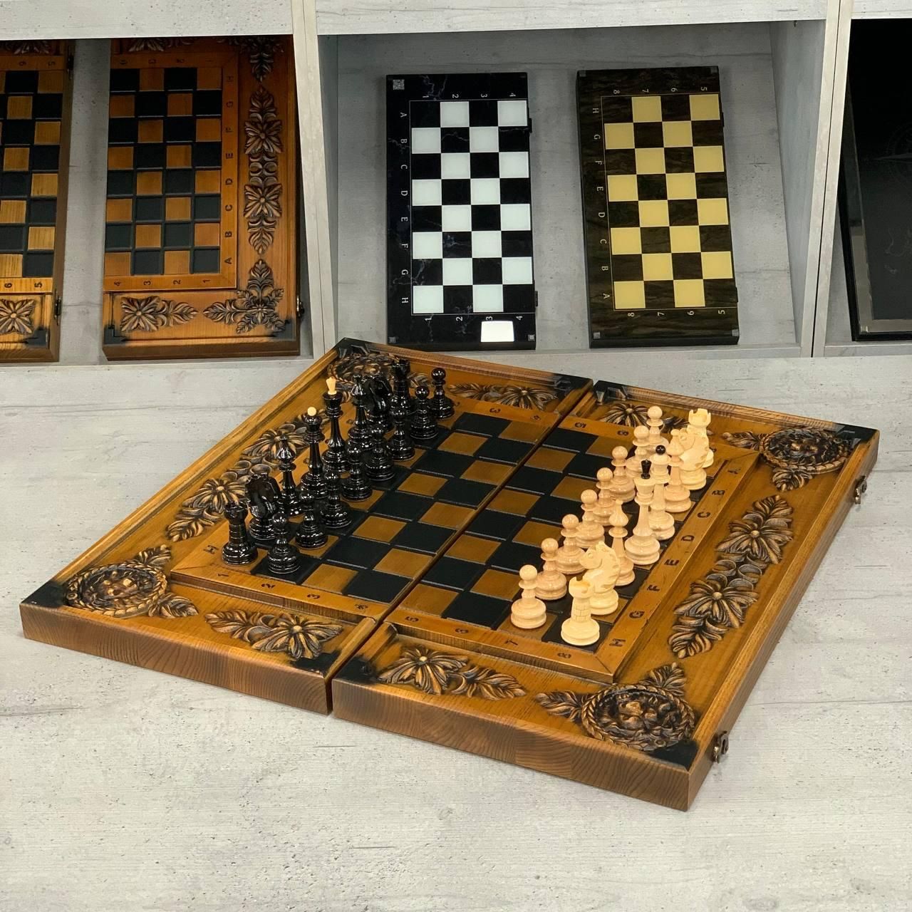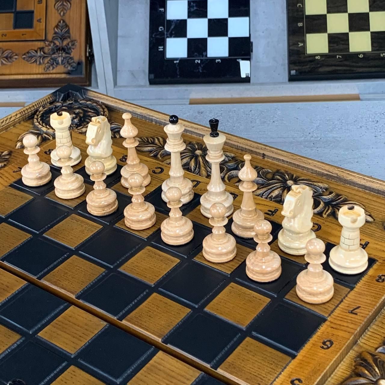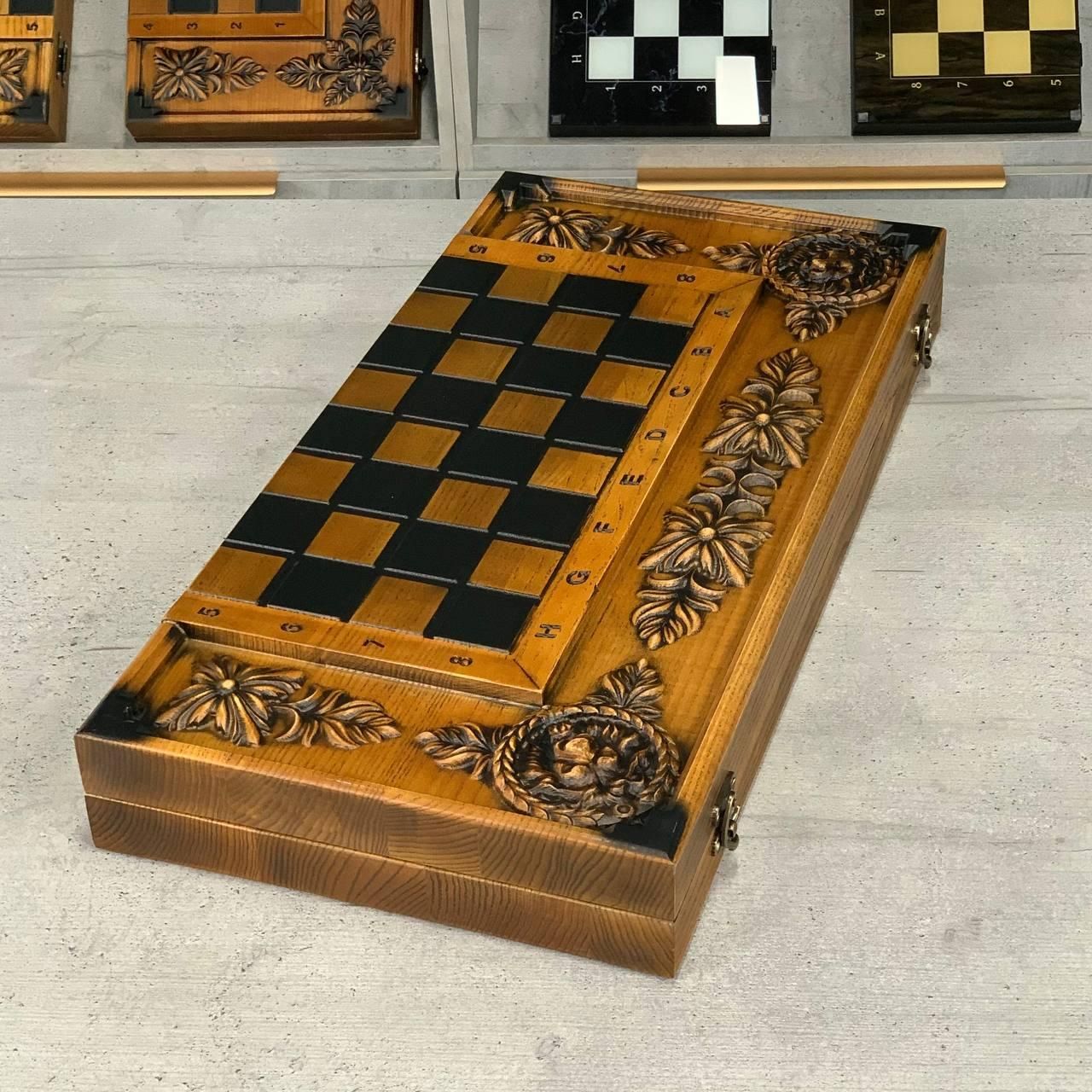 Нарди, шахи та шашки з дерева — різьблений набір з левом із ясеня Цей елітний набір шахи, шашки та нарди 3 в 1 виготовлений із натурального ясеня та прикрашений ручним різьбленням. На зовнішній частині майстерно вирізьблений образ лева, що символізує силу та велич, а внутрішнє оформлення з різьбленим левом додає набору неповторного характеру. Набір дозволяє грати у шахи, шашки, довгі нарди та короткі нарди, поєднуючи в собі практичність і вишуканість. Вага майже 7 кг та великі розміри (64×64 см у розкладеному вигляді) підкреслюють його статусність і надійність. Це не просто настільна гра, а витвір мистецтва, що стане справжньою окрасою вашої колекції чи подарунком преміум-класу. Особливості Цей набір виготовлений з якісного масиву ясеня, відомого своєю міцністю та довговічністю. Ручне різьблення з образом лева робить набір ексклюзивним і неповторним. Універсальність: можливість грати у шахи, шашки та нарди (короткі й довгі). Великий розмір і солідна вага створюють особливу атмосферу гри та підкреслюють престиж. Фішки зі смоли приємні на дотик, діаметром 30 мм, зручні для гри. Детальний опис Коричнево-бежеве оформлення підкреслює натуральну красу дерева. Фігури для шахів виконані в класичному стилі та гармонійно поєднуються з різьбленим полем. Комплектація містить усе необхідне: фішки, шахові фігури, кубики. Набір чудово підійде як для колекції, так і для подарунка. Технічні характеристики Параметр Значення Гра Шахи, шашки, нарди (довгі та короткі) Зовнішнє оформлення Різьблення по дереву (елементи лева) Внутрішнє оформлення Різьблення по дереву (лев) Розмір у складеному вигляді 64×32 см Розмір у розкладеному вигляді 64×64 см Матеріал Дерево (ясень) Колір Коричневий, бежевий Вага 8 кг Фішки Смола Діаметр фішок 30 мм Кубики Пластик, 12 мм Комплектація Шахи/шашки/нарди (1 шт), фігури, фішки (15 світлих + 15 темних), кубики (2 шт) Чому варто купити? Це класичні різьблені нарди, шахи та шашки з дерева, які поєднують у собі красу, практичність та ексклюзивність. Вони стануть чудовим подарунком або сімейною реліквією, яка передаватиметься з покоління в покоління. ???? Замовляйте за телефоном: +380732670070 Не зупиняйтеся на досягнутому! На нашому сайті представлені й , які зможуть задовольнити будь-які ваші смаки та вподобання. : Це класична гра, яка протягом століть розважає людей всіх віків. : Інтелектуальна гра, яка кине виклик вашому розуму. Аксесуари для настільних ігор: , , та багато іншого, що зробить ваші ігри ще більш комфортними та приємними. Завітайте до нашого і знайдіть ту гру, яка стане вашим новим улюбленим дозвіллям! Залишилися питання? Телефонуйте нам. Наші менеджери завжди на зв'язку і готові відповісти на всі ваші запитання Адреса: Україна м. Стрий, вул. Заньковецької, буд. 2, другий поверх
