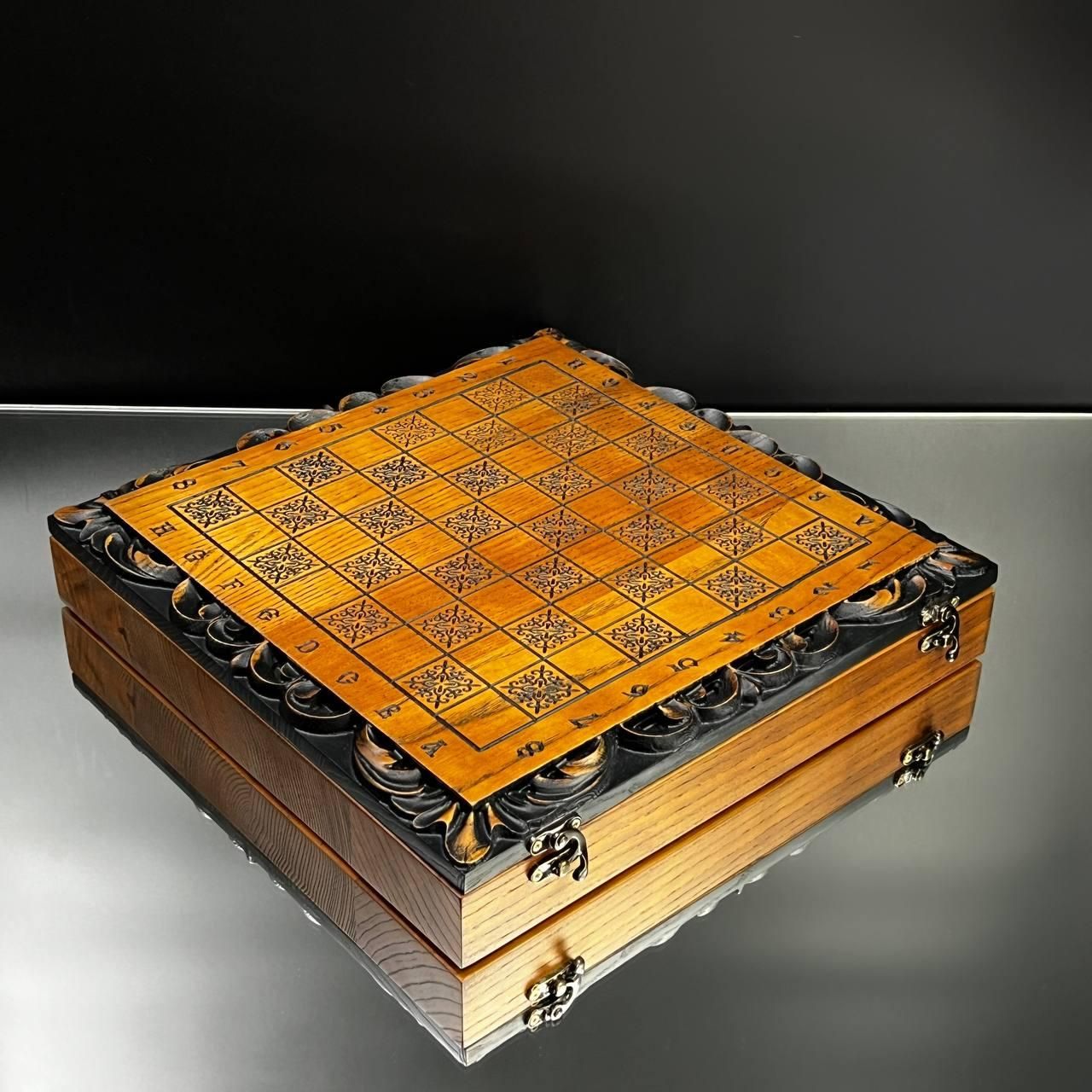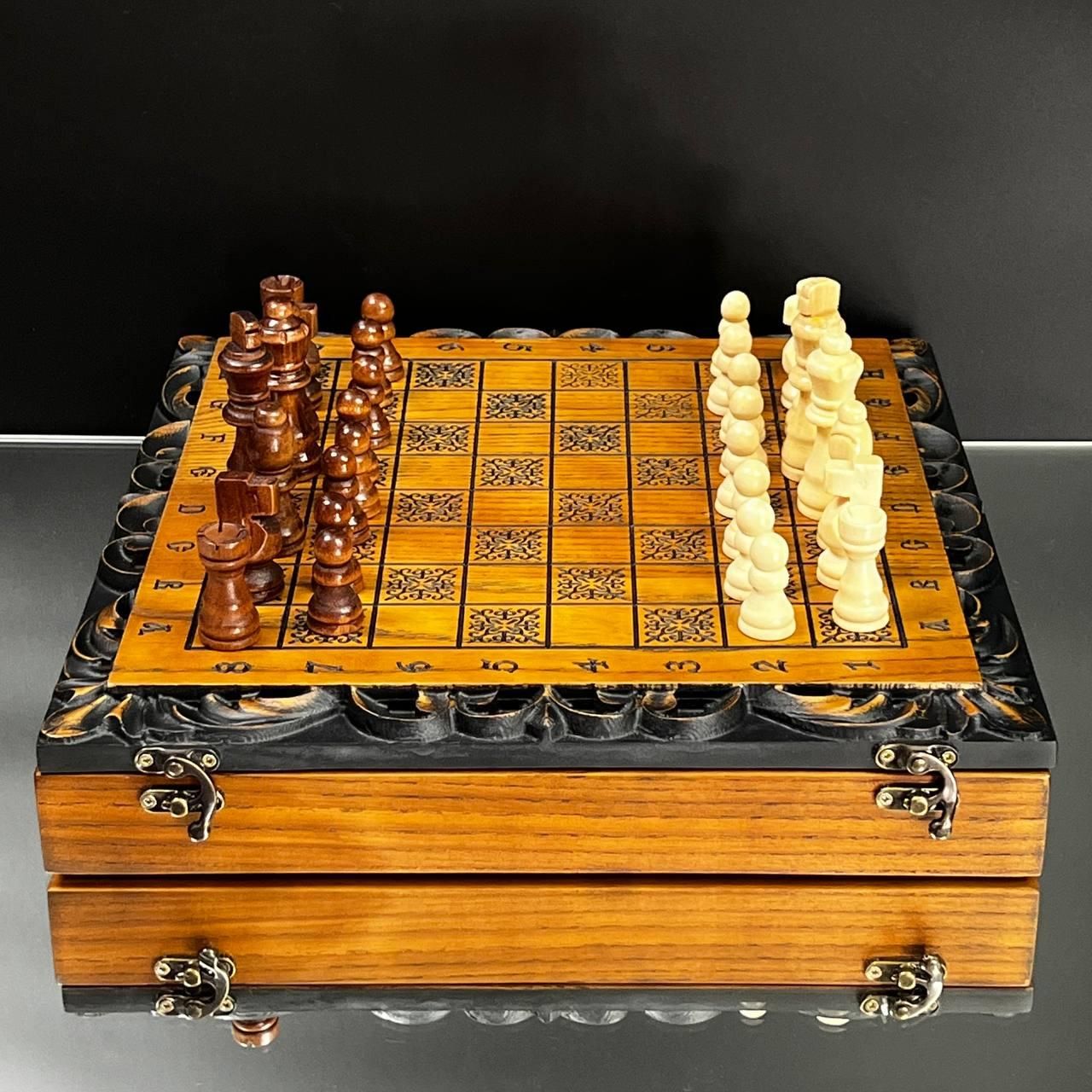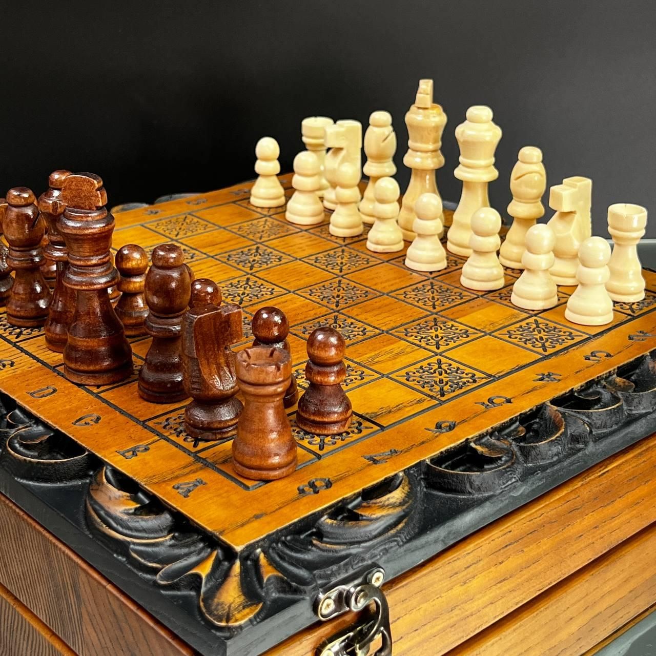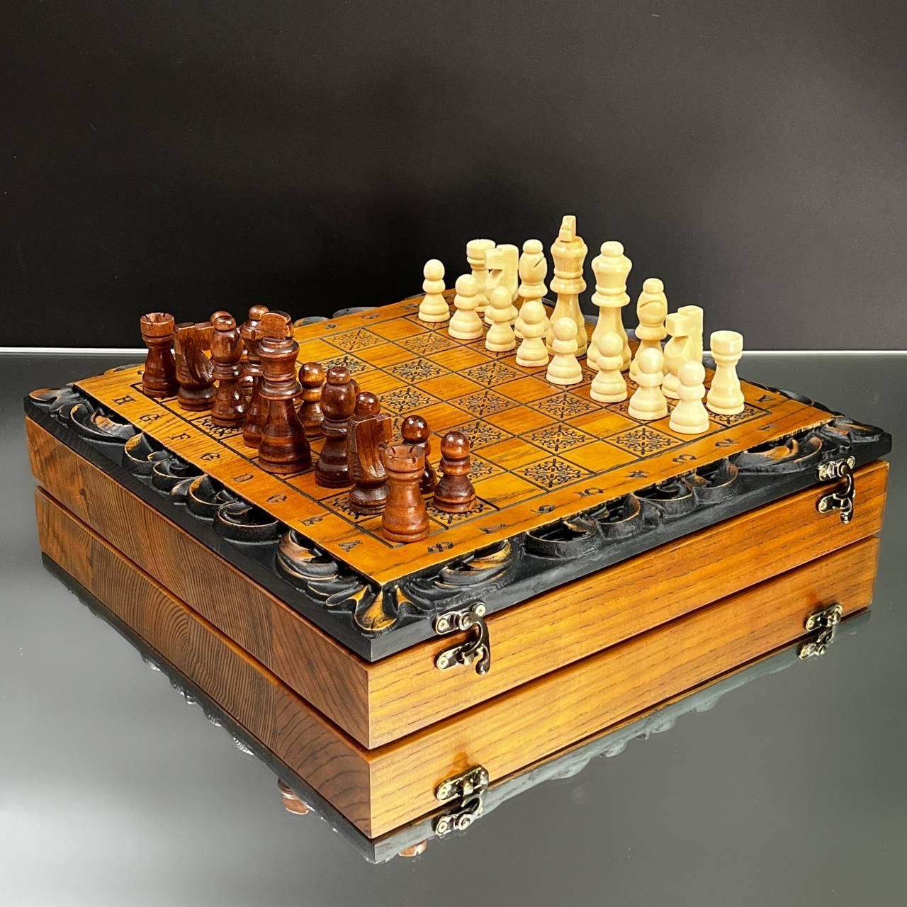 Унікальний дизайн та майстерне виконання Ці шахи стануть символом елегантності та престижу у вашій колекції або чудовим подарунком для близьких. Виготовлені з добірного дуба, вони прикрашені детальним різьбленням по дереву, яке додає набору особливого шарму та вишуканості. Внутрішня частина виробу виконана у техніці випалювання, що підкреслює природну красу деревини. Завдяки компактним розмірам 33×33 см ці шахи зручно розмістити на будь-якому столі, а вага 2,95 кг забезпечує надійну стійкість під час гри. Особливості товару Дерево преміум-якості: виготовлено з дуба та липи. Ексклюзивний декор: різьблення зовні та випалювання всередині. Універсальний набір: грайте як в шахи, так і в шашки. Ідеальний подарунок: підходить для поціновувачів вишуканих подарунків. Фігури та фішки виготовлені з дерева липи, що додає природної естетики. Зручний діаметр фішок у 23 мм ідеально пасує для гри, забезпечуючи комфортне управління ними. Коричнево-бежевий колір набору гармонійно підходить до класичного інтер'єру, а стильне різьблення робить ці шахи чудовим елементом декору. Технічні характеристик Розмір: 33×33 см. Матеріал: дуб, липа. Вага: 2,95 кг. Колір: коричневий, бежевий. Діаметр фішок: 23 мм. Не пропустіть можливість придбати ці елегантні шахи – порадуйте себе чи близьких особливим подарунком. Замовляйте зараз та підкресліть свій смак і стиль! Не зупиняйтеся на досягнутому! На нашому сайті представлені й , які зможуть задовольнити будь-які ваші смаки та вподобання. : Це класична гра, яка протягом століть розважає людей всіх віків. : Інтелектуальна гра, яка кине виклик вашому розуму. Аксесуари для настільних ігор: , , та багато іншого, що зробить ваші ігри ще більш комфортними та приємними. Завітайте до нашого і знайдіть ту гру, яка стане вашим новим улюбленим дозвіллям! Залишилися питання? Телефонуйте нам. Наші менеджери завжди на зв'язку і готові відповісти на всі ваші запитання Адреса: Україна м. Стрий, вул. Заньковецької, буд. 2, другий поверх