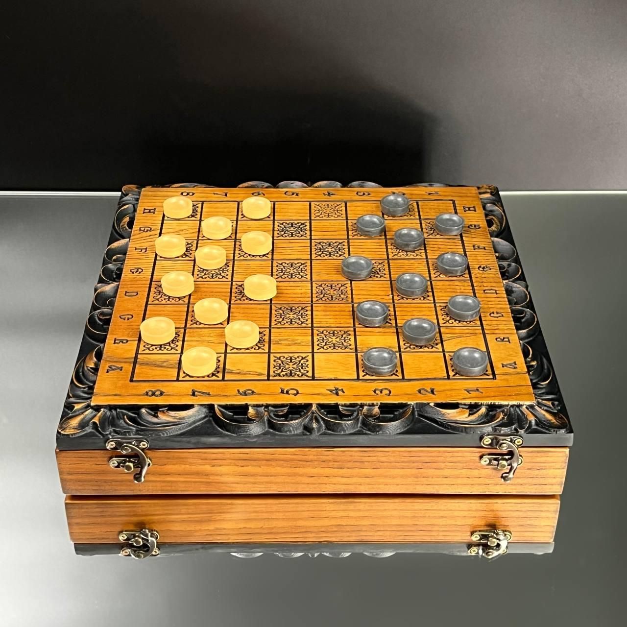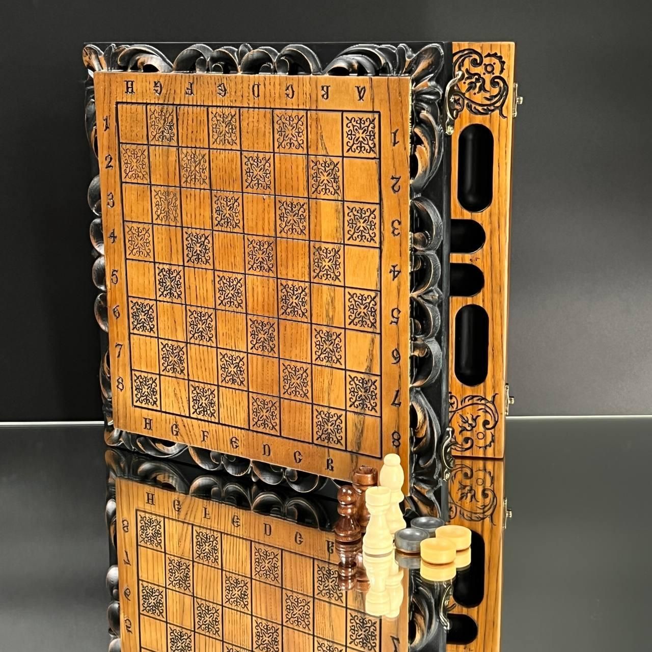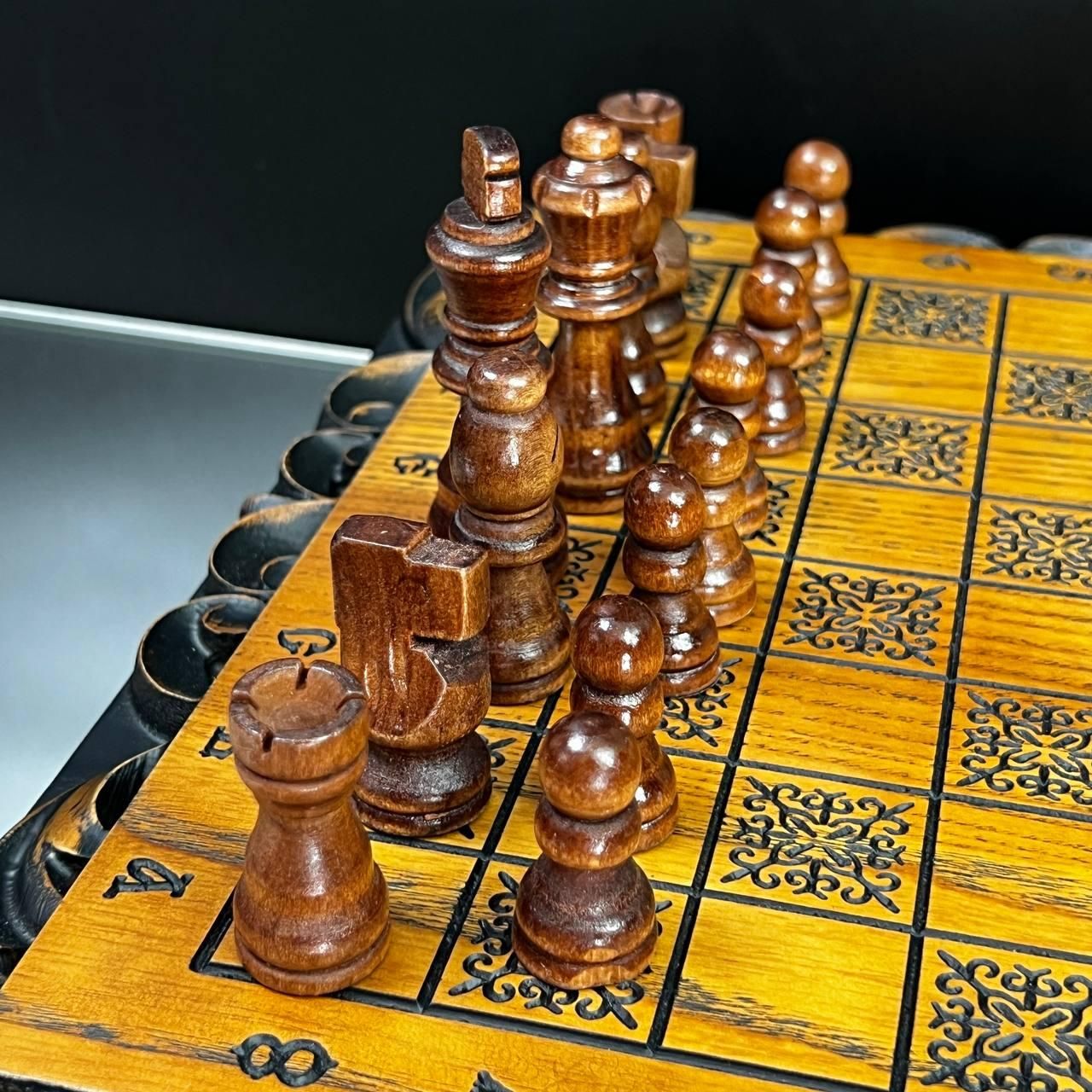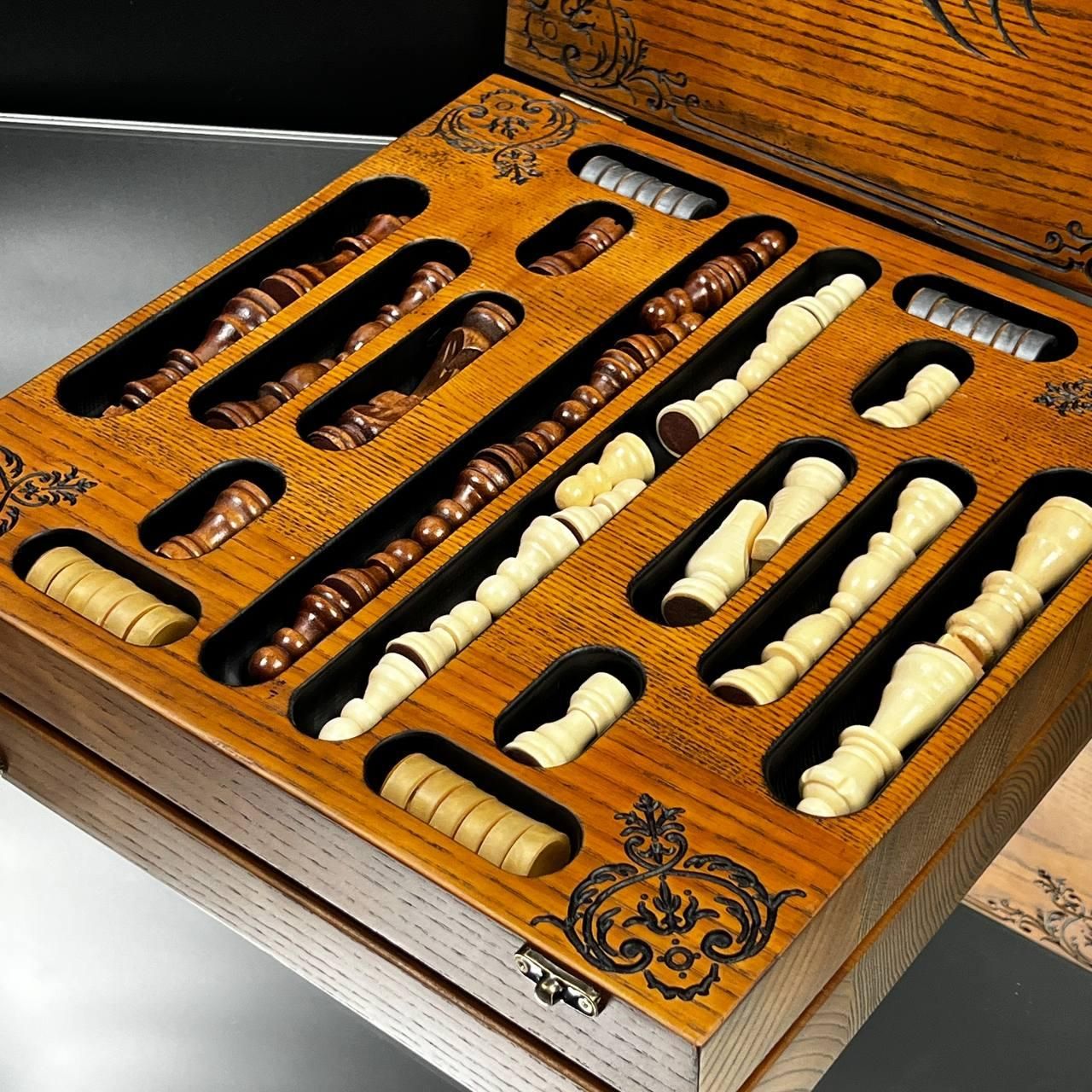 Унікальний дизайн та майстерне виконання Ці шахи стануть символом елегантності та престижу у вашій колекції або чудовим подарунком для близьких. Виготовлені з добірного дуба, вони прикрашені детальним різьбленням по дереву, яке додає набору особливого шарму та вишуканості. Внутрішня частина виробу виконана у техніці випалювання, що підкреслює природну красу деревини. Завдяки компактним розмірам 33×33 см ці шахи зручно розмістити на будь-якому столі, а вага 2,95 кг забезпечує надійну стійкість під час гри. Особливості товару Дерево преміум-якості: виготовлено з дуба та липи. Ексклюзивний декор: різьблення зовні та випалювання всередині. Універсальний набір: грайте як в шахи, так і в шашки. Ідеальний подарунок: підходить для поціновувачів вишуканих подарунків. Фігури та фішки виготовлені з дерева липи, що додає природної естетики. Зручний діаметр фішок у 23 мм ідеально пасує для гри, забезпечуючи комфортне управління ними. Коричнево-бежевий колір набору гармонійно підходить до класичного інтер'єру, а стильне різьблення робить ці шахи чудовим елементом декору. Технічні характеристик Розмір: 33×33 см. Матеріал: дуб, липа. Вага: 2,95 кг. Колір: коричневий, бежевий. Діаметр фішок: 23 мм. Не пропустіть можливість придбати ці елегантні шахи – порадуйте себе чи близьких особливим подарунком. Замовляйте зараз та підкресліть свій смак і стиль! Не зупиняйтеся на досягнутому! На нашому сайті представлені й , які зможуть задовольнити будь-які ваші смаки та вподобання. : Це класична гра, яка протягом століть розважає людей всіх віків. : Інтелектуальна гра, яка кине виклик вашому розуму. Аксесуари для настільних ігор: , , та багато іншого, що зробить ваші ігри ще більш комфортними та приємними. Завітайте до нашого і знайдіть ту гру, яка стане вашим новим улюбленим дозвіллям! Залишилися питання? Телефонуйте нам. Наші менеджери завжди на зв'язку і готові відповісти на всі ваші запитання Адреса: Україна м. Стрий, вул. Заньковецької, буд. 2, другий поверх
