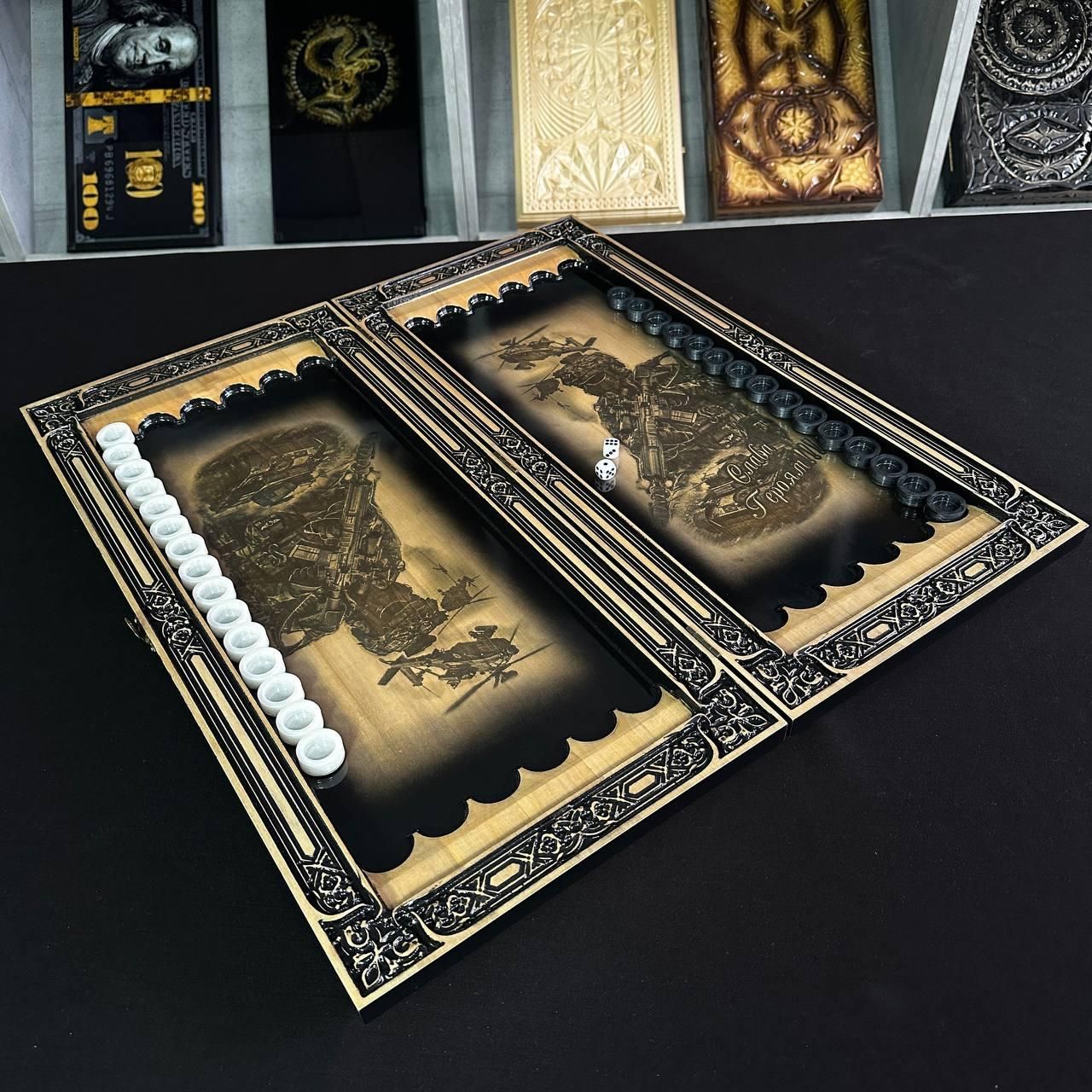 Ручні дерев'яні нарди Тризуб 68×32см патріотичніРучні дерев'яні нарди Тризуб 68×32см патріотичні