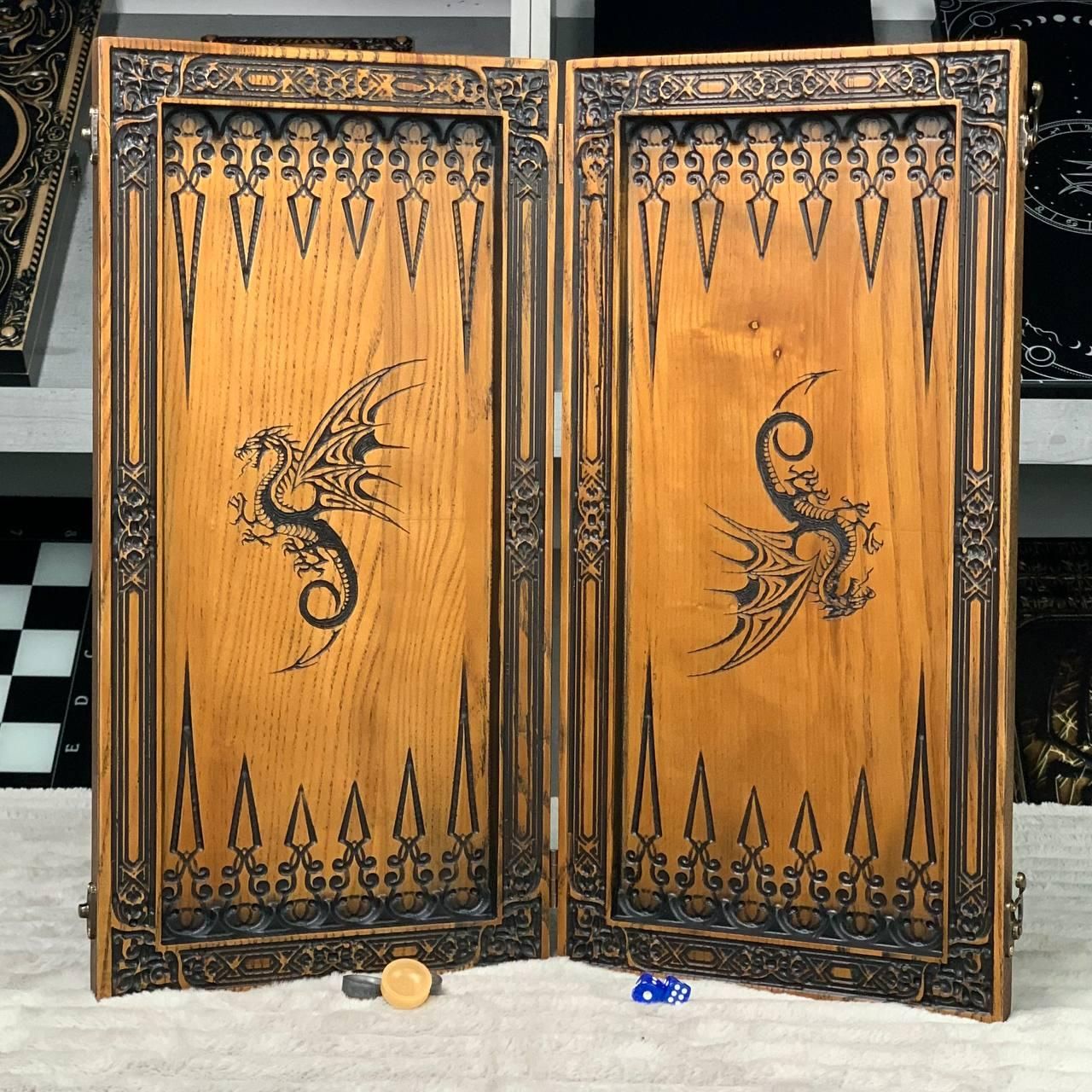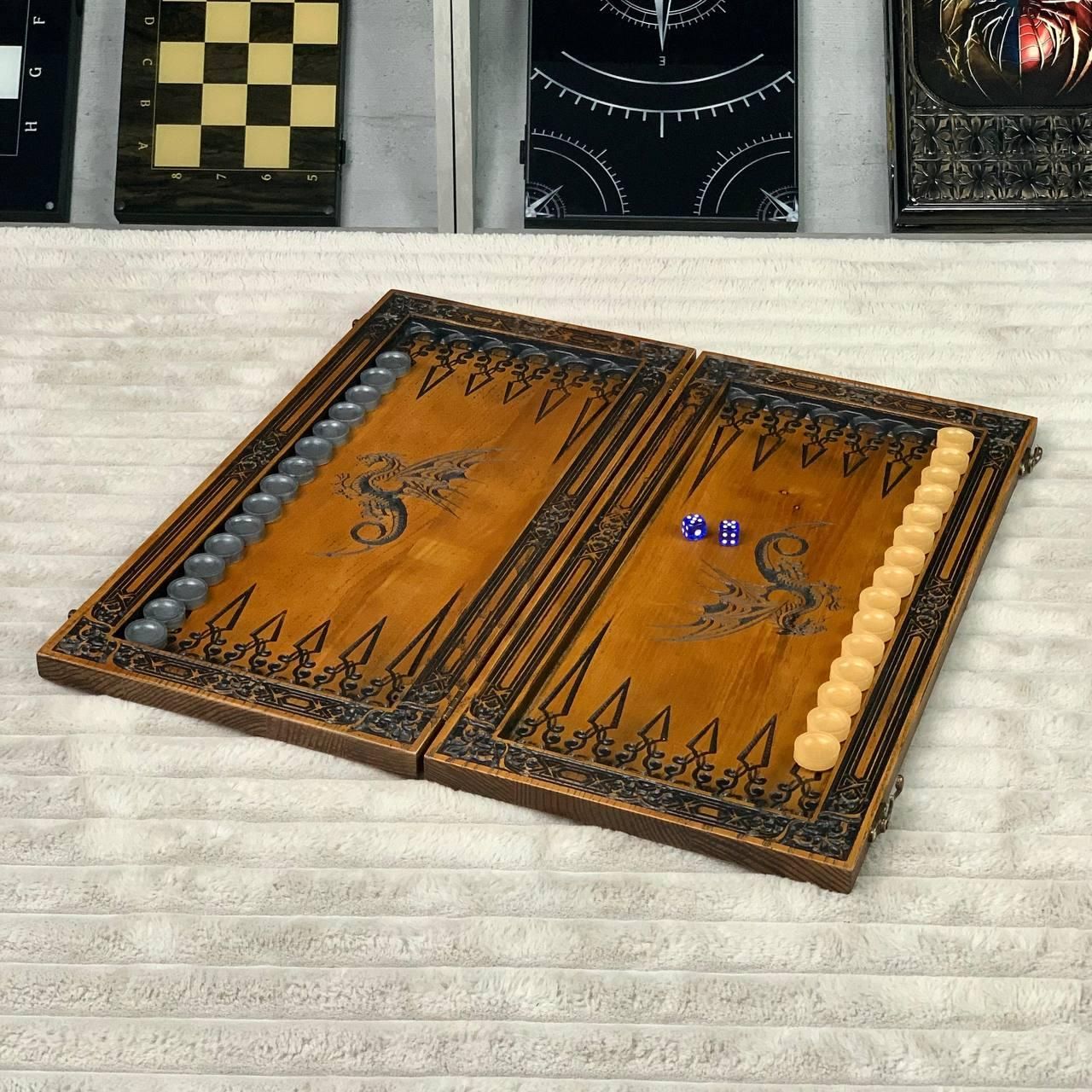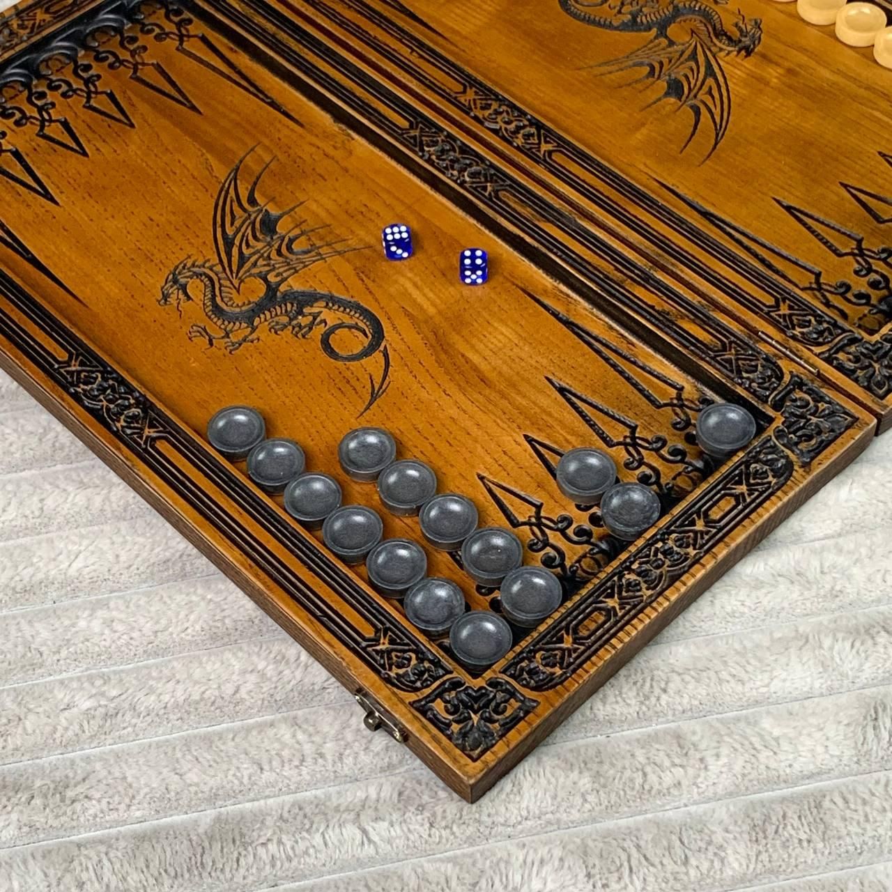Нарди дерев’яні “Дракон” — різьблення та випалювання по дереву, ясен, подарункові довгі та короткі нарди (46×23 см) Подарункові дерев’яні нарди “Дракон” — вишукана гра для поціновувачів традицій та краси. Зовнішня сторона прикрашена різьбленням по дереву із зображенням дракона, а внутрішнє поле виконане у техніці випалювання по дереву. Модель придатна для коротких і довгих нард, поєднує міцність ясеневого дерева та унікальну ручну роботу. Ідеально підійдуть як нарди на подарунок або елемент інтер’єру. Особливості товару Різьблений “Дракон” на зовнішньому боці — символ сили та удачі. Внутрішнє поле — художнє випалювання по дереву. Матеріал — натуральний ясен, міцний та довговічний. Можливість гри в короткі нарди та довгі нарди. Фішки зі смоли діаметром 23 мм, кубики 12 мм. Універсальний подарунок для друзів, колег, близьких. Нарди “Дракон” створені для тих, хто цінує не лише гру, а й атмосферу. Вони чудово виглядають як у використанні, так і на полиці. Завдяки ясену конструкція легка, але міцна, а ручне оздоблення робить кожен набір унікальним. Особливості та технічні характеристики Характеристика Значення Тип гри Нарди (короткі / довгі) Зовнішнє оформлення Різьблення по дереву, “Дракон” Внутрішнє оформлення Випалювання по дереву Матеріал Дерево (ясен) Розміри складені 46×23 см Розміри розкладені 46×46 см Розмір ігрового поля 40×42 см Колір Коричневий, бежевий Вага 1,95 кг Фішки Смола, діаметр 23 мм Кубики Пластик, 12 мм Комплектація Нарди (1 шт), фішки (15 світлих + 15 темних), кубики (2 шт) Замовляйте дерев’яні нарди “Дракон” вже сьогодні — стильний подарунок із душею та характером! Не зупиняйтеся на досягнутому! На нашому сайті представлені й , які зможуть задовольнити будь-які ваші смаки та вподобання. : Це класична гра, яка протягом століть розважає людей всіх віків. : Інтелектуальна гра, яка кине виклик вашому розуму. Аксесуари для настільних ігор: , , та багато іншого, що зробить ваші ігри ще більш комфортними та приємними. Завітайте до нашого і знайдіть ту гру, яка стане вашим новим улюбленим дозвіллям! Залишилися питання? Телефонуйте нам. Наші менеджери завжди на зв'язку і готові відповісти на всі ваші запитання Адреса: Україна м. Стрий, вул. Заньковецької, буд. 2, другий поверх