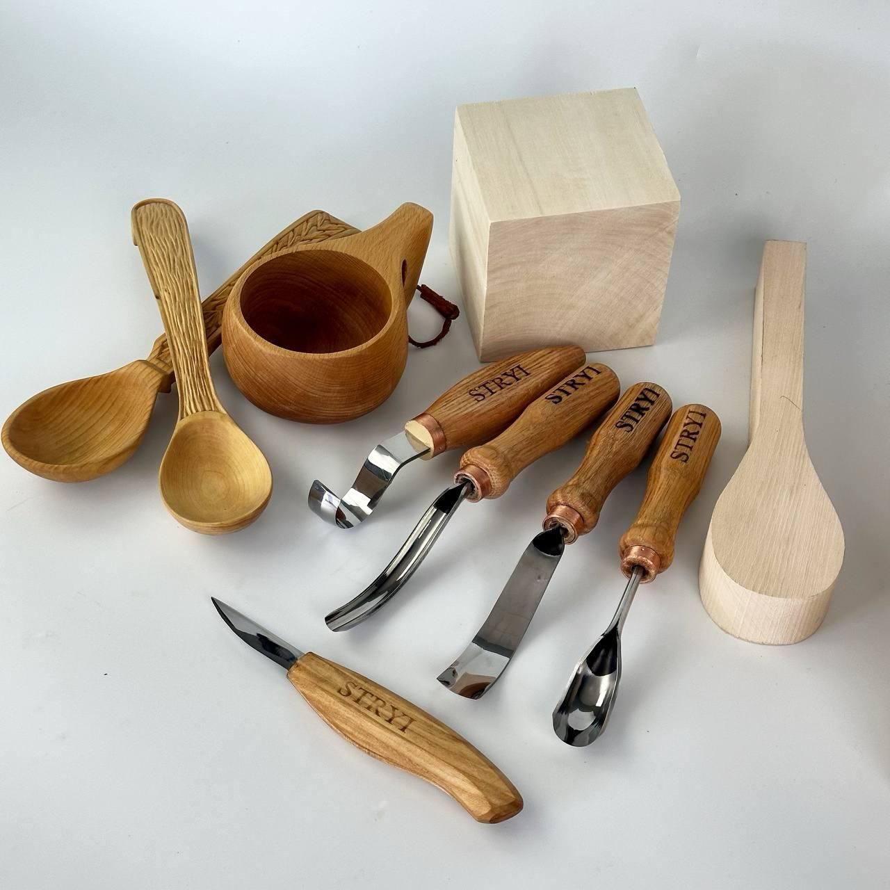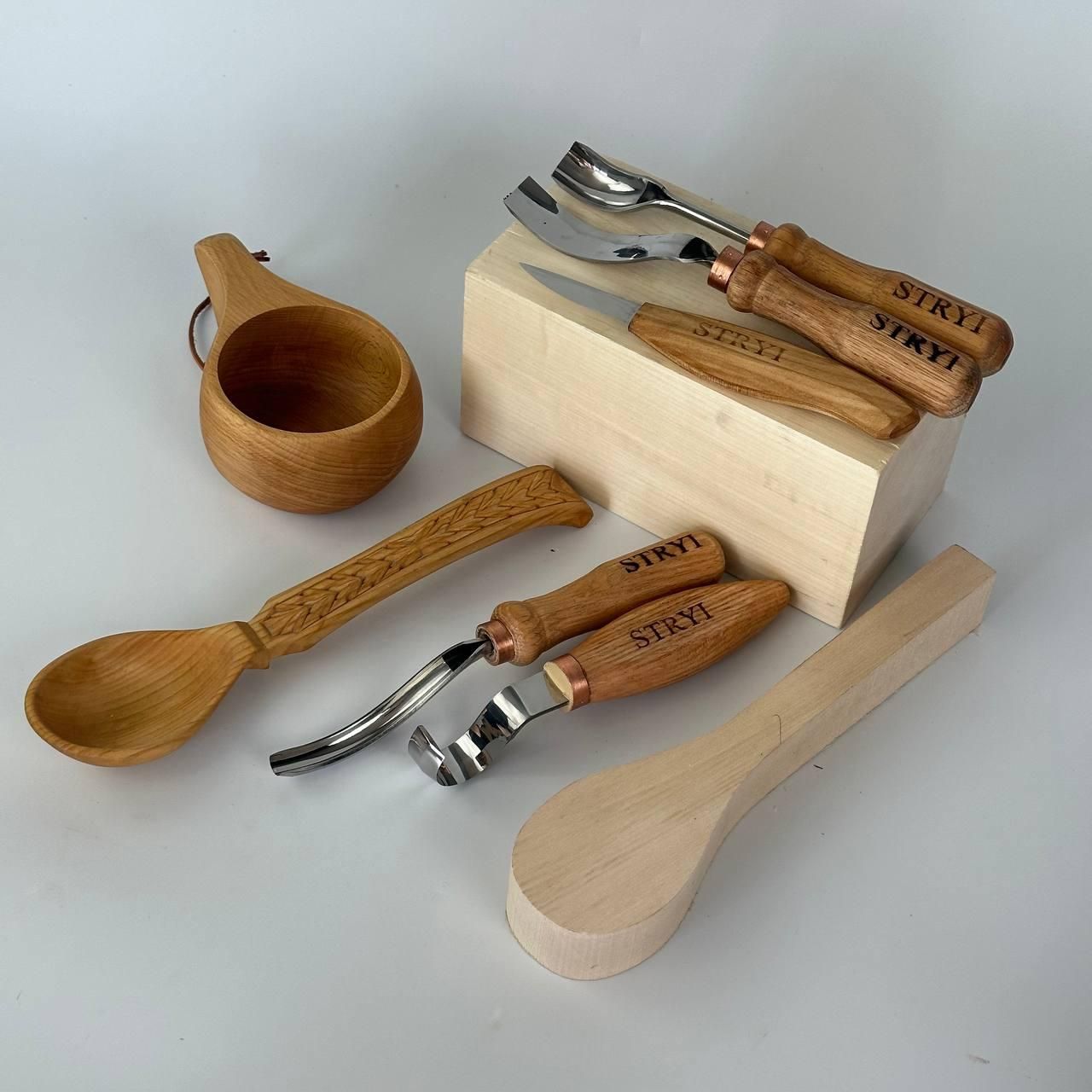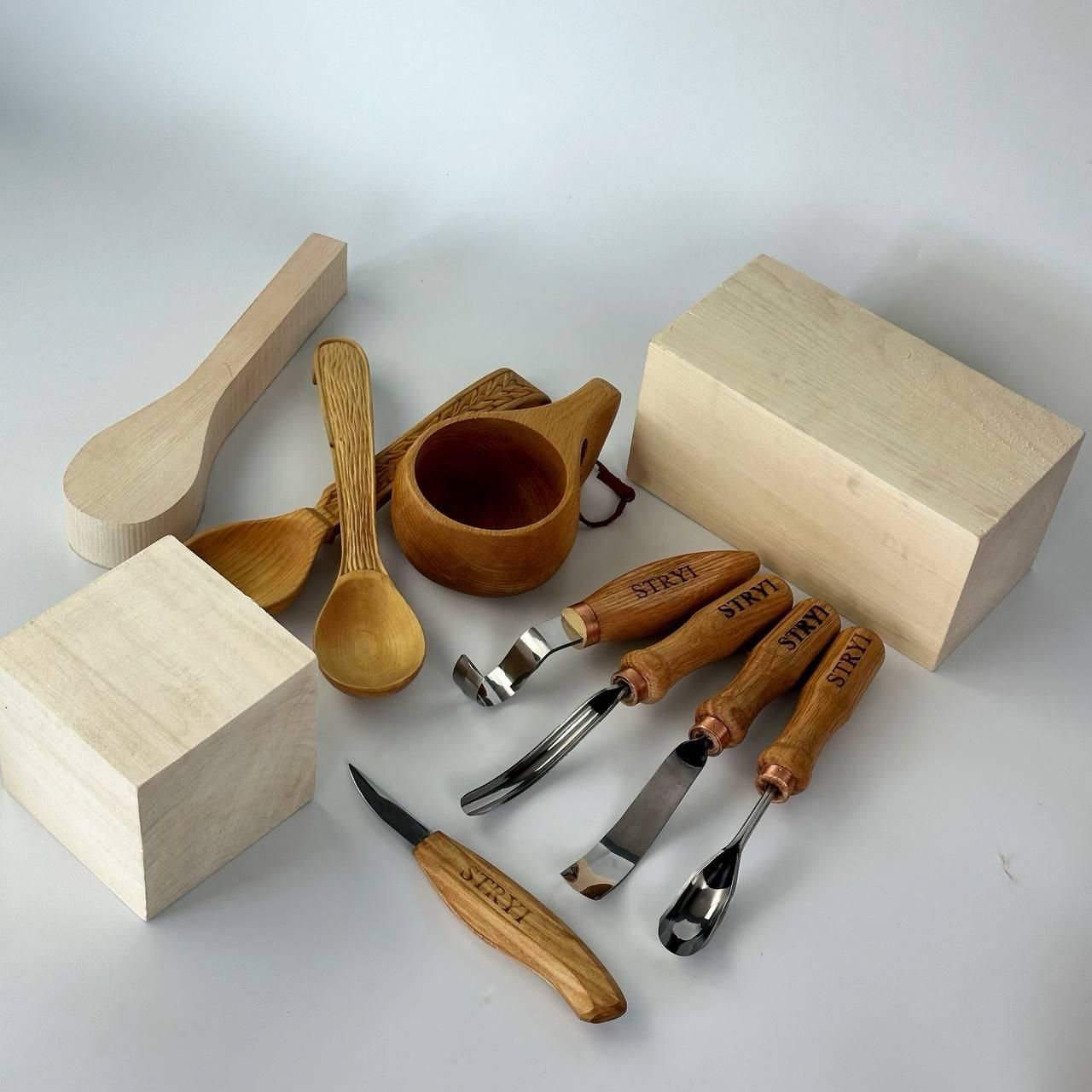 Набір STRYI для вирізання кукси з дерева: 3 інструменти та заготовка з липи