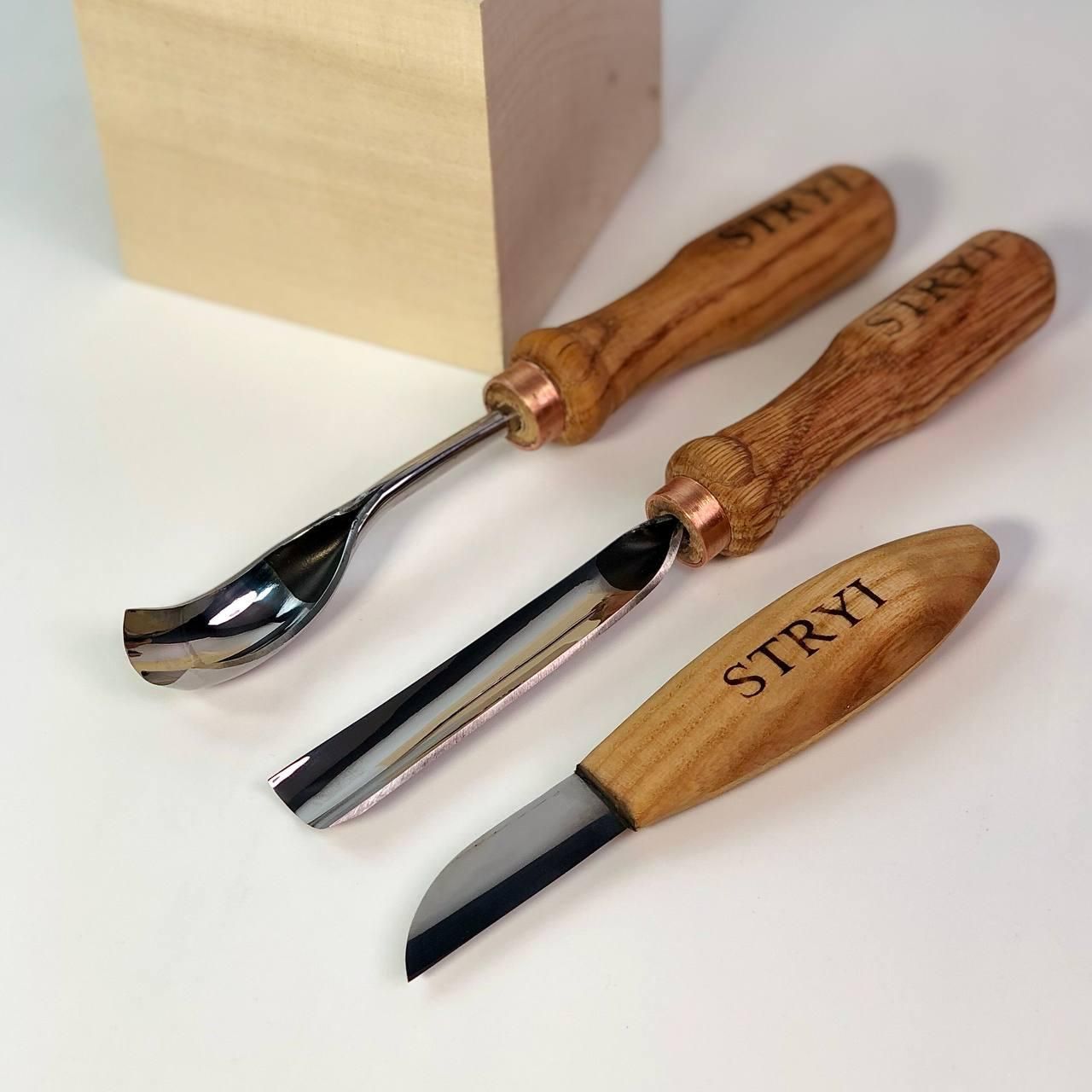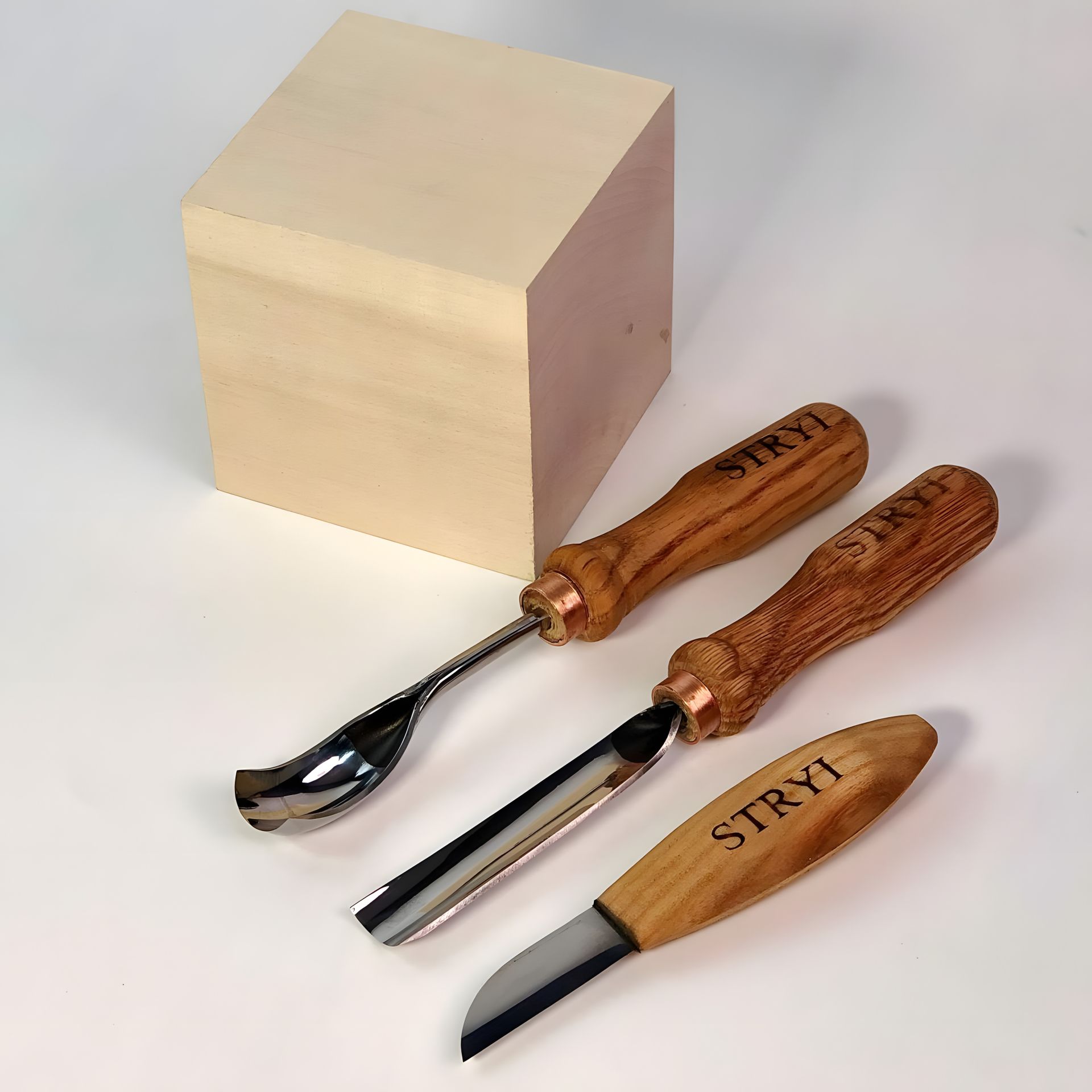 Набір STRYI для вирізання кукси з дерева: 3 інструменти та заготовка з липи