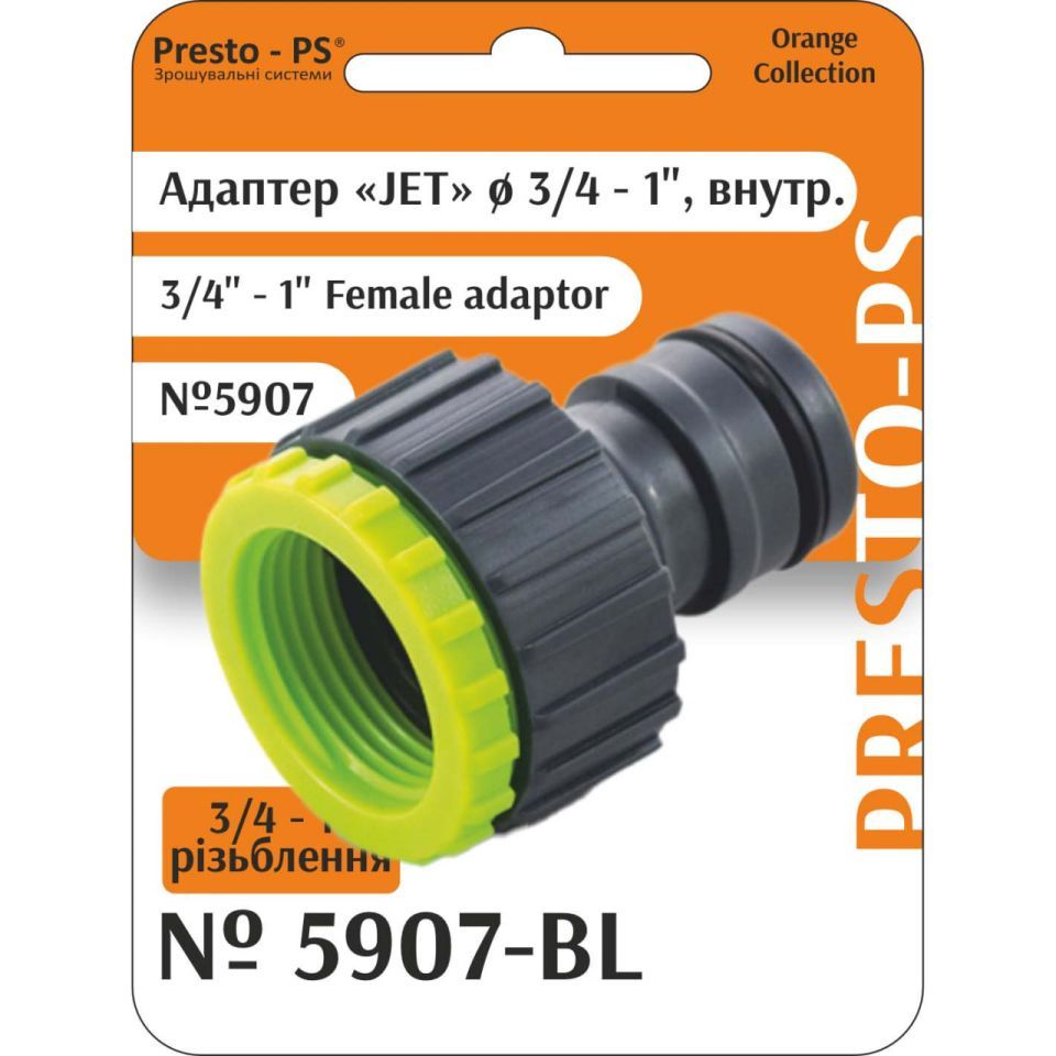 Адаптер під конектор Presto-PS (5907-BL) застосовують у комбінації зі швидкоз'ємними конекторами та кранами або трійниками із зовнішнім різьбленням 3/4 або 1 дюйм для під'єднання садових шлангів різних діаметрів до системи водопостачання. Належить ця модель до серії Jet зі збільшеним внутрішнім діаметром адаптера для збільшення водовиливу. Робоче тиск до 4 атмосфер. Виготовляється адаптер з якісного пластику, стійкого до механічних навантажень, дії розчинів добрив та ультрафіолетового випромінювання.