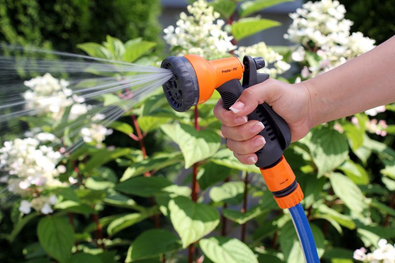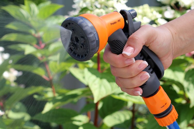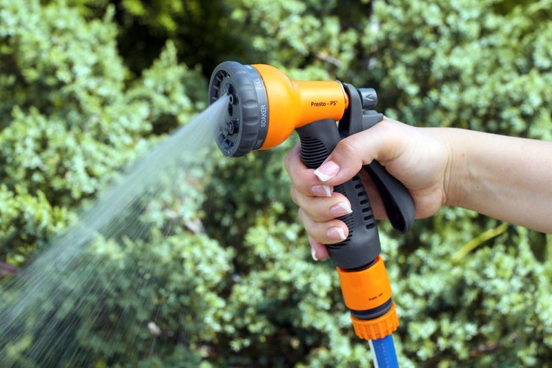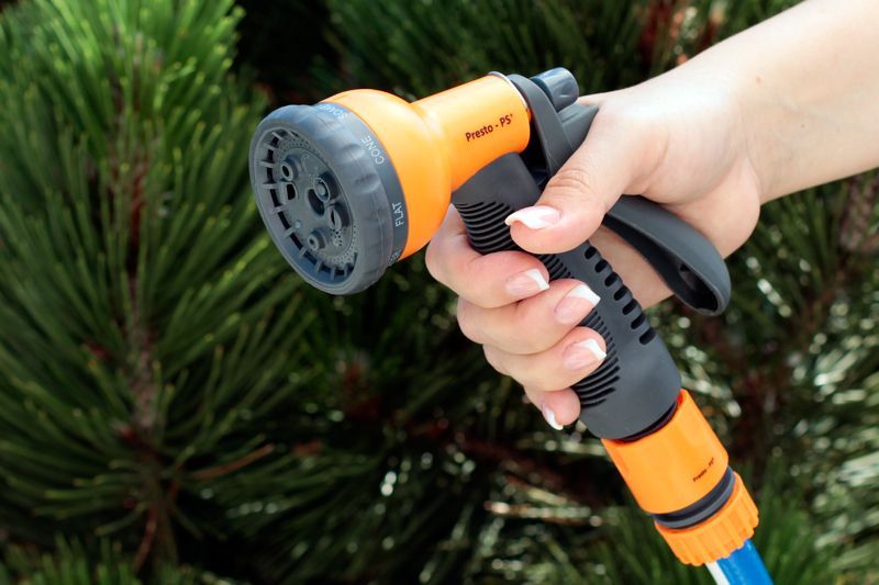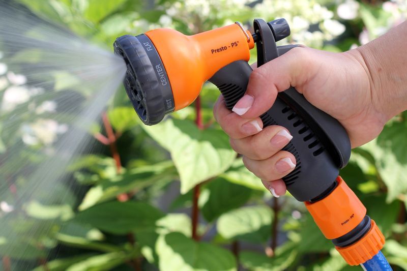 Пістолет для поливу Presto-PS (7202-BL) використовується для ручного поливу газонів середньої та невеликої площі, міст, квітників, прибирання доріжок на прибудинковій території, миття садового інвентарю та техніки. Поворотна головка пістолета має 8 положень і регулює форму струменя і ступінь розпилення води. Можливі режими поливу: м'який струмінь, дрібний струмінь, кутовий, дощ, душ, туман, плоский горизонтальний, конус. Підключається до садових шлангів діаметром 1/2, 5/8 та 3/4 дюйма за допомогою стандартних конекторів. Рекомендований робочий тиск у системі від 2 до 4 атмосфер. Виготовлений зрошувальний пістолет з якісного пластику, довговічний, стійкий до механічних пошкоджень, впливу ультрафіолету та водорозчинних удобрень.