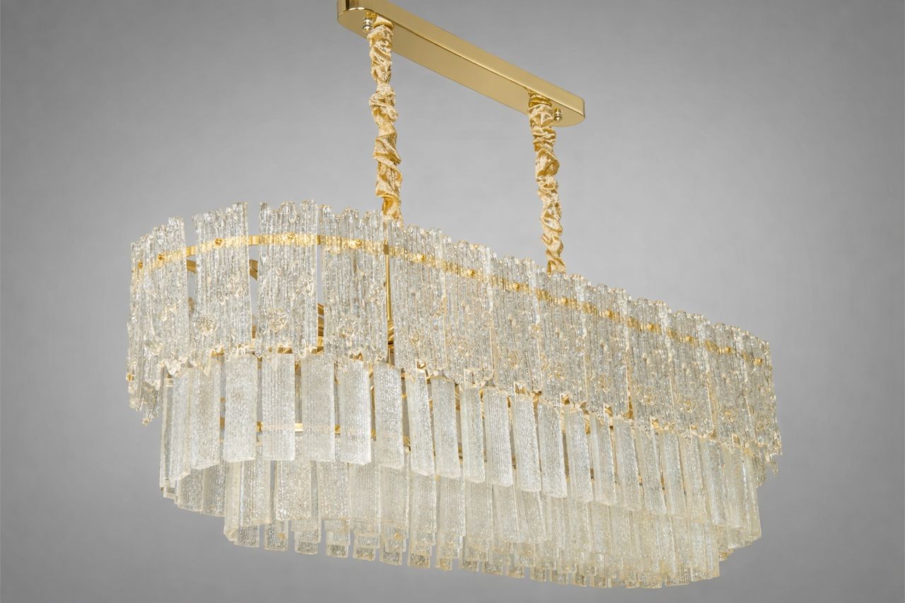 Дизайн люстри побудований на поєднанні суворої геометрії та природної фактури. Каркас виготовлений із високоякісного металу з гальванічним покриттям «глянцеве золото», що має ідеальний дзеркальний блиск. Видовжена овальна форма корпусу ідеально підкреслює архітектуру приміщень та довгих обідніх зон.