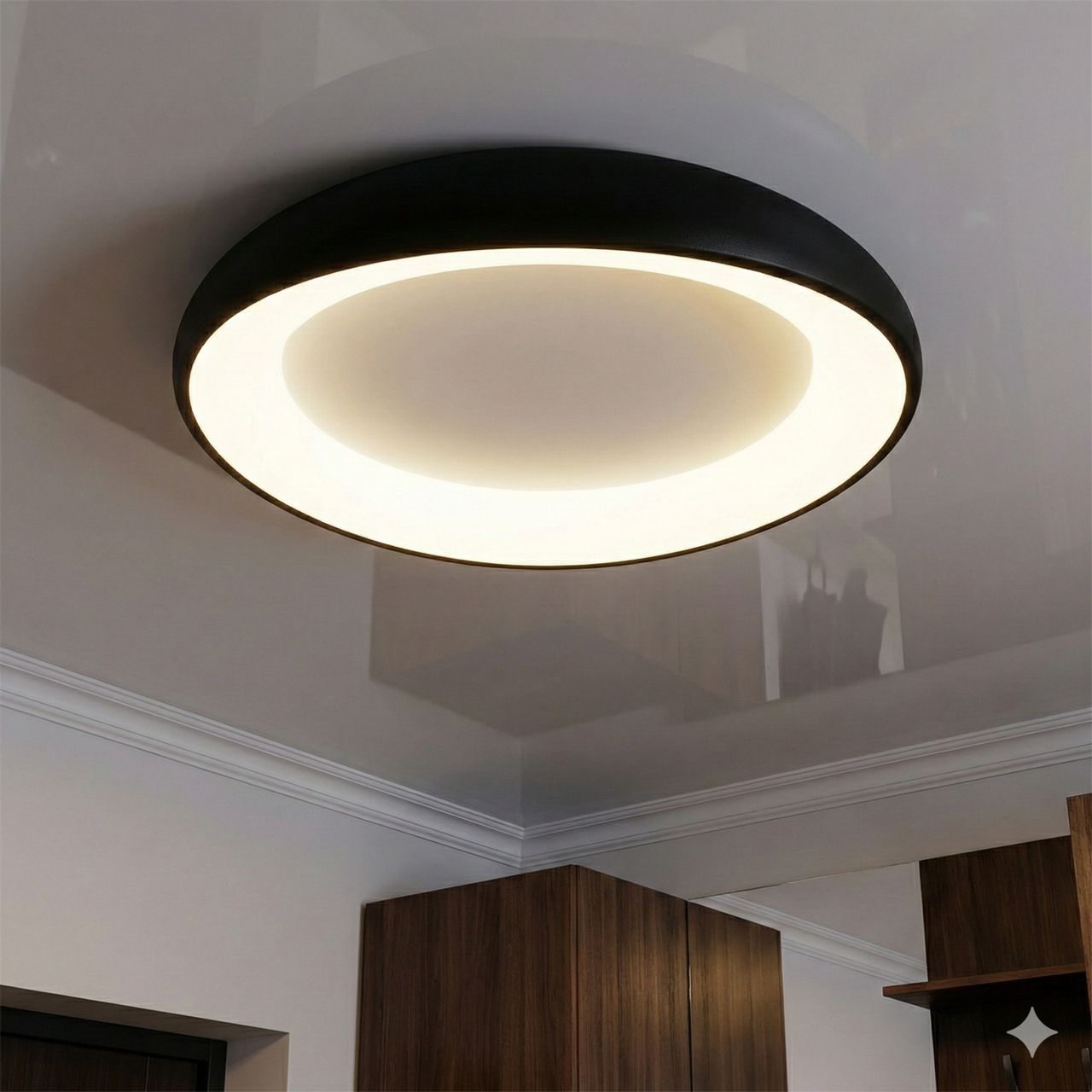 Головна особливість світильника — приховане джерело світла. Світлодіодна матриця розташована всередині кільцевого заглиблення, що створює ефект м'якого обволікаючого світіння. Світло не засліплює очі, а рівномірно заливає кімнату, створюючи візуальний комфорт. Чорний колір корпусу створює стильний контраст із яскравою світловою лінією, що ідеально пасує до сучасних інтер'єрів.