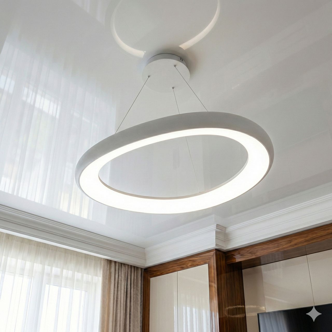 Елегантне та легке світлове рішення для основного освітлення обідніх зон, кухонь та віталень площею до 12 м². Завдяки унікальній асиметричній формі «кільця» та білосніжному матовому покриттю, ця люстра створює відчуття чистоти та простору, наповнюючи оселю м'яким, рівномірним сяйвом.