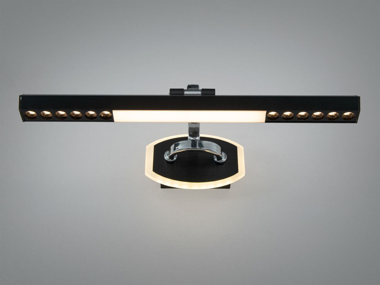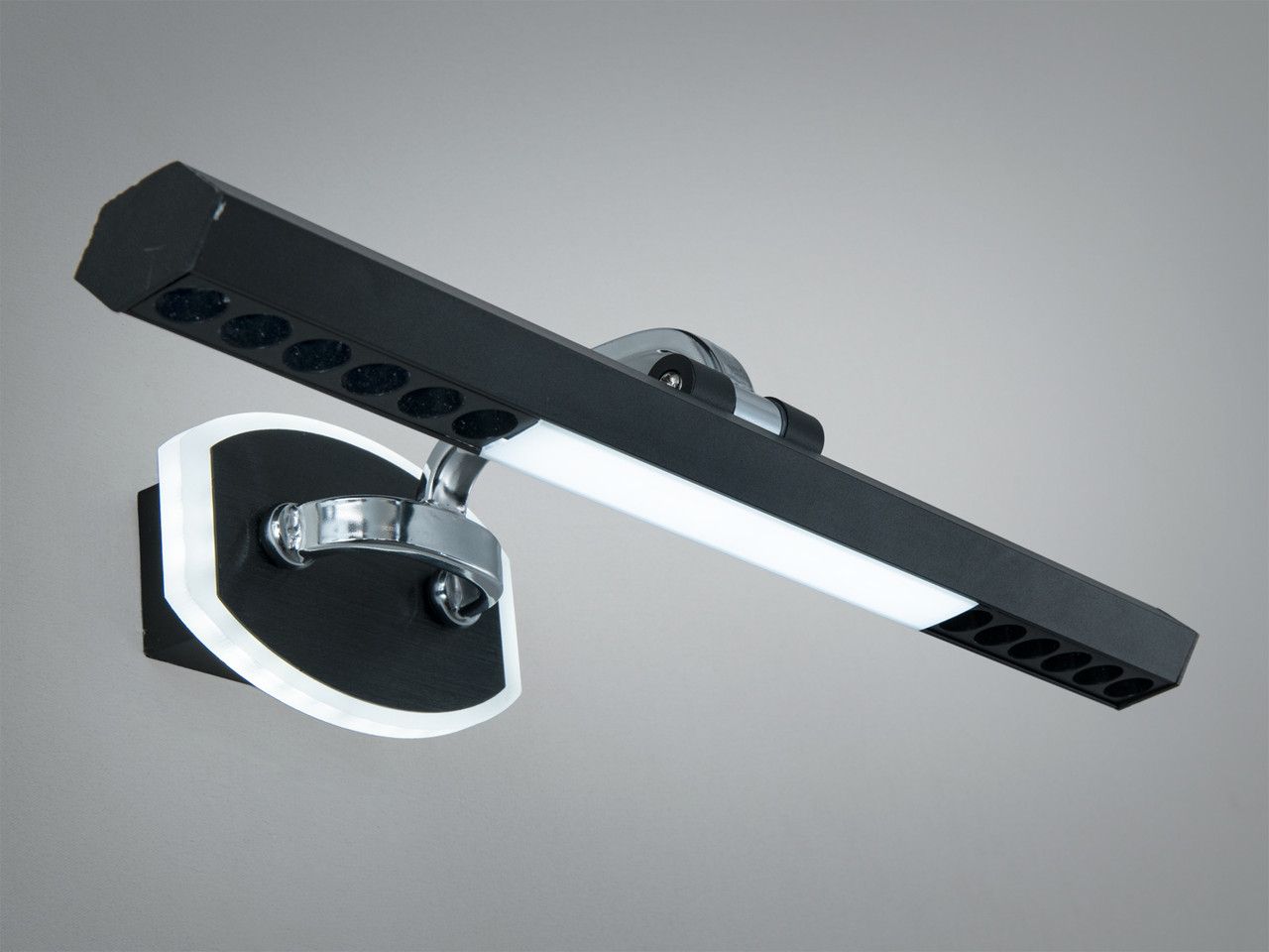 Підсвітка для дзеркал та картин 16W LED "Focus Line", Чорна (40 см) Сучасне та функціональне світлове рішення для акцентного освітлення дзеркал у ванних кімнатах, передпокоях та підсвічування предметів мистецтва площею до 10 м². Завдяки гібридній системі лінз та дифузора, цей світильник забезпечує ідеальну передачу кольорів та чіткість деталей, стаючи стильним елементом інтер'єру в стилі хай-тек або мінімалізм. Візуальний аналіз та дизайн Дизайн світильника виконаний у строгому техно-стилі. Корпус являє собою видовжений прямокутний профіль із металу, покритий якісною чорною матовою фарбою. Конструкція тримається на витонченому кронштейні з хромованими елементами, що дозволяє винести джерело світла на 23 см від стіни для кращого кута падіння променів. Головна особливість моделі — комбінована оптика. Центральна частина оснащена матовим акриловим розсіювачем для м'якої заливки, а бічні секції містять ряд спрямованих лінз (по 5 з кожного боку). Така система дозволяє одночасно отримати рівномірне підсвічування обличчя перед дзеркалом та яскраві світлові акценти на поверхні, що додає інтер'єру професійного вигляду. Найкращі сценарії використання Завдяки значному відступу від стіни (23 см) та високій потужності (16 Вт), модель є оптимальною для: Над дзеркалом у ванній або холі: Забезпечує ідеальне фронтальне світло для нанесення макіяжу або гоління без тіней на обличчі. Підсвітка картин та галерейних стін: Виносний кронштейн дозволяє рівномірно освітити полотно зверху донизу, не створюючи бліків на склі. Для офісу та кабінету: Може використовуватися для підсвічування дипломів, карт або сертифікатів на стінах. Над туалетним столиком у спальні: Створює професійну зону догляду за собою. Чому ця модель вирішує ваші завдання Характеристика Ваша проблема або сумнів Як це працює на практиці 3 режими світла Важко обрати між затишним та робочим білим світлом. Ви змінюєте температуру (3200K / 4100K / 6500K) простим клацанням вашого звичайного настінного вимикача. Гібридне світло Звичайні бра світять занадто слабко або нерівномірно. Поєднання розсіювача та 10 точкових лінз гарантує високу яскравість (880 Лм) та чітку спрямованість променів. Виліт від стіни 23 см Бра перекривається рамою дзеркала. Значний відступ дозволяє монтувати світильник навіть над масивними дзеркалами з об'ємними рамами. Функція пам'яті: НІ Хочеться легко змінювати атмосферу. Світильник не запам'ятовує останній колір, що дозволяє швидко переходити між режимами при кожному ввімкненні. Технічні характеристики Параметр Значення Тип світильника Настінна підсвітка (лінійна) Довжина 40 см Висота 9 см Відступ від стіни 23 см Розмір основи (бази) 14 х 9 см Робоча напруга 220 В (стандартна мережа) Загальна потужність 16 Вт Світловий потік 880 Лм Площа освітлення 0 - 10 м² Температура світла 3200K (тепле), 4100K (нейтральне), 6500K (холодне) Матеріал каркасу Метал / Хром Тип кріплення Монтажна планка (8 см) Вага 0.67 кг Гарантія 12 місяців Поради щодо встановлення Просте підключення: Світильник постачається повністю зібраним. Установка проводиться на металеву монтажну планку (8 см), яка надійно фіксує прилад до стіни. Основа розміром 14х9 см дозволяє акуратно приховати місце виводу кабелю. Безпека: Ступінь захисту IP20 допускає використання у ванних кімнатах лише за умови гарної вентиляції та встановлення у зонах, де ви