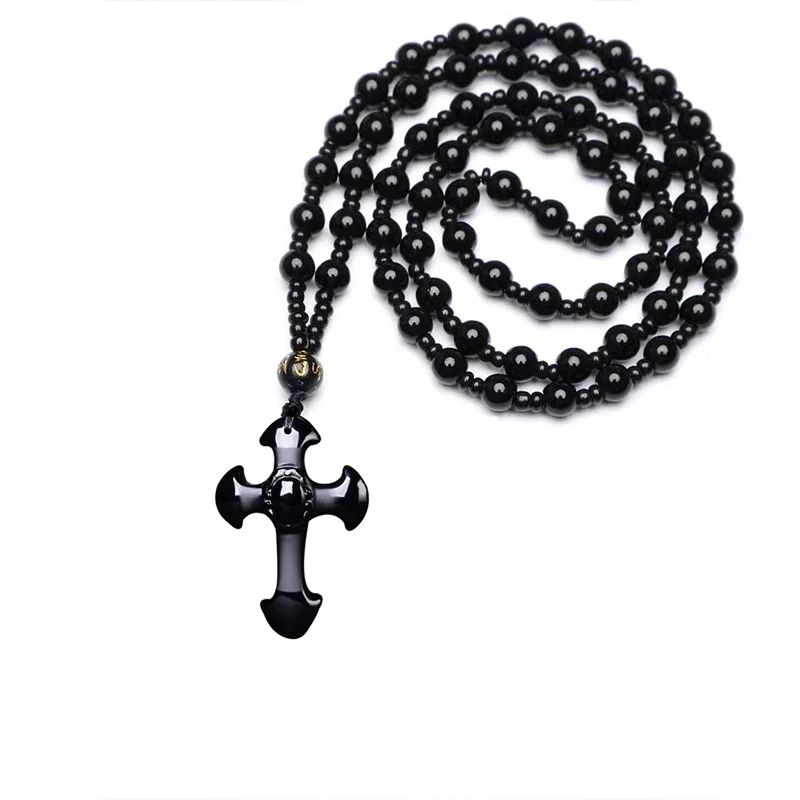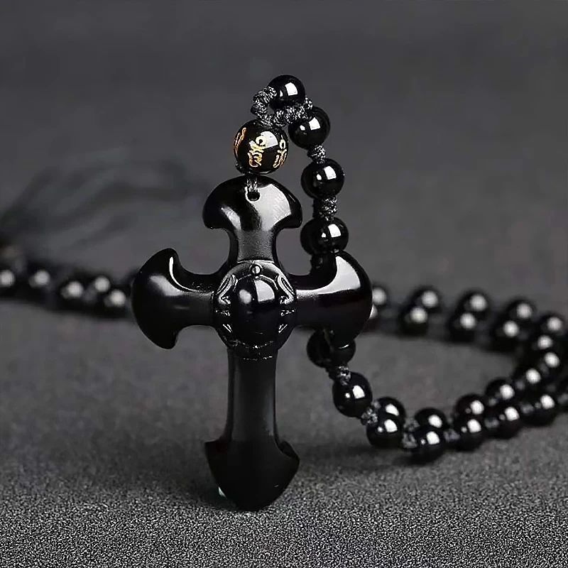 Кулон чорний хрест з обсидіану підвіска натуральний камінь обсидіан