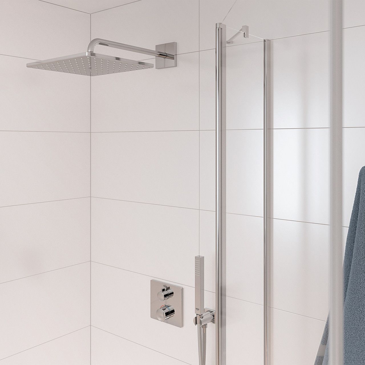 Душова система прихованого монтажу термостатична Grohe QuickFix Precision Grohtherm Cube 34881000 — це ідеальний комплект для вашої ванної кімнати, який поєднує стиль, зручність і високу ефективність. Цей комплект містить універсальну вбудовану частину Rapido SmartBox для прихованого монтажу, що об'єднує сучасний дизайн і видатну функціональність, завдяки німецькій майстерності. Технологія GROHE TurboStat гарантує постійну температуру води з моменту вмикання, а технологія GROHE Water Saving знижує споживання води й енергії, не обмежуючи продуктивність. Кнопка GROHE SafeStop налаштована на температуру 38 °C для запобігання опікам, і система GROHE SafeStop Plus дає змогу встановити граничну температуру на рівні 43 °C для додаткової безпеки. Верхній душ діаметром 310х310 мм і кронштейн завдовжки 422 мм пропонують розслаблювальний режим GROHE PureRain. Ручний душ зі шлангом TwistStop завдовжки 1500 мм пропонує класичну універсальну струмінь Normal Spray. Технологія GROHE DreamSpray забезпечує рівномірний потік води з кожної форсунки, які легко очищаються за допомогою системи SpeedClean. Довговічне покриття GROHE Long-Life збереже бездоганний зовнішній вигляд упродовж тривалого часу. Встановлення системи настінної накладки швидке та просте завдяки системі GROHE FastFixation, яка містить систему фіксації, настінні розетки, ущільнення й кріплення, гарантуючи брак ризику протікання. Душова система з термостатичним керуванням Grohe QuickFix Precision Grohtherm Cube — це стильно, інтелектуально та гарантовано приносить задоволення від прийняття душу!