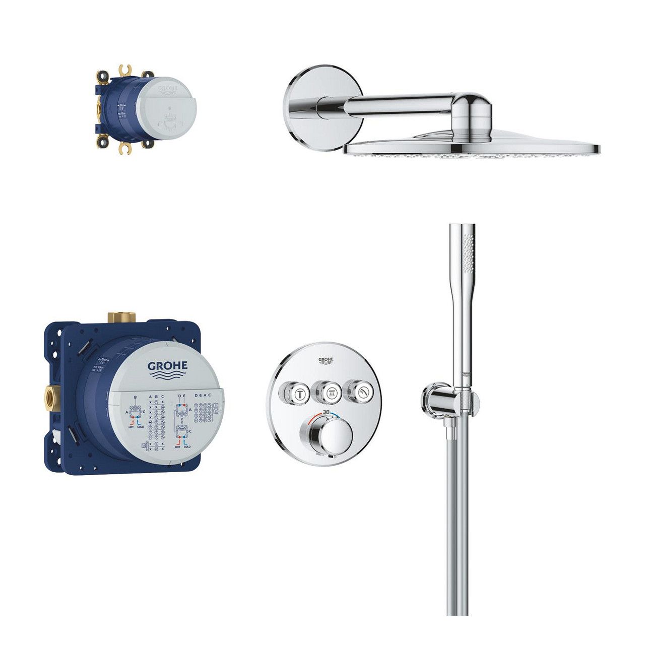 Система містить термостат прихованого монтажу з трьома виходами, що дає змогу під'єднувати різні джерела води. Це дає вам можливість легко керувати температурою й напором води, забезпечуючи максимальний комфорт. Технологія GROHE SmartControl дає змогу зручно вибирати режими водного потоку одним натисканням кнопки, що робить процес керування душем інтуїтивно зрозумілим і простим.