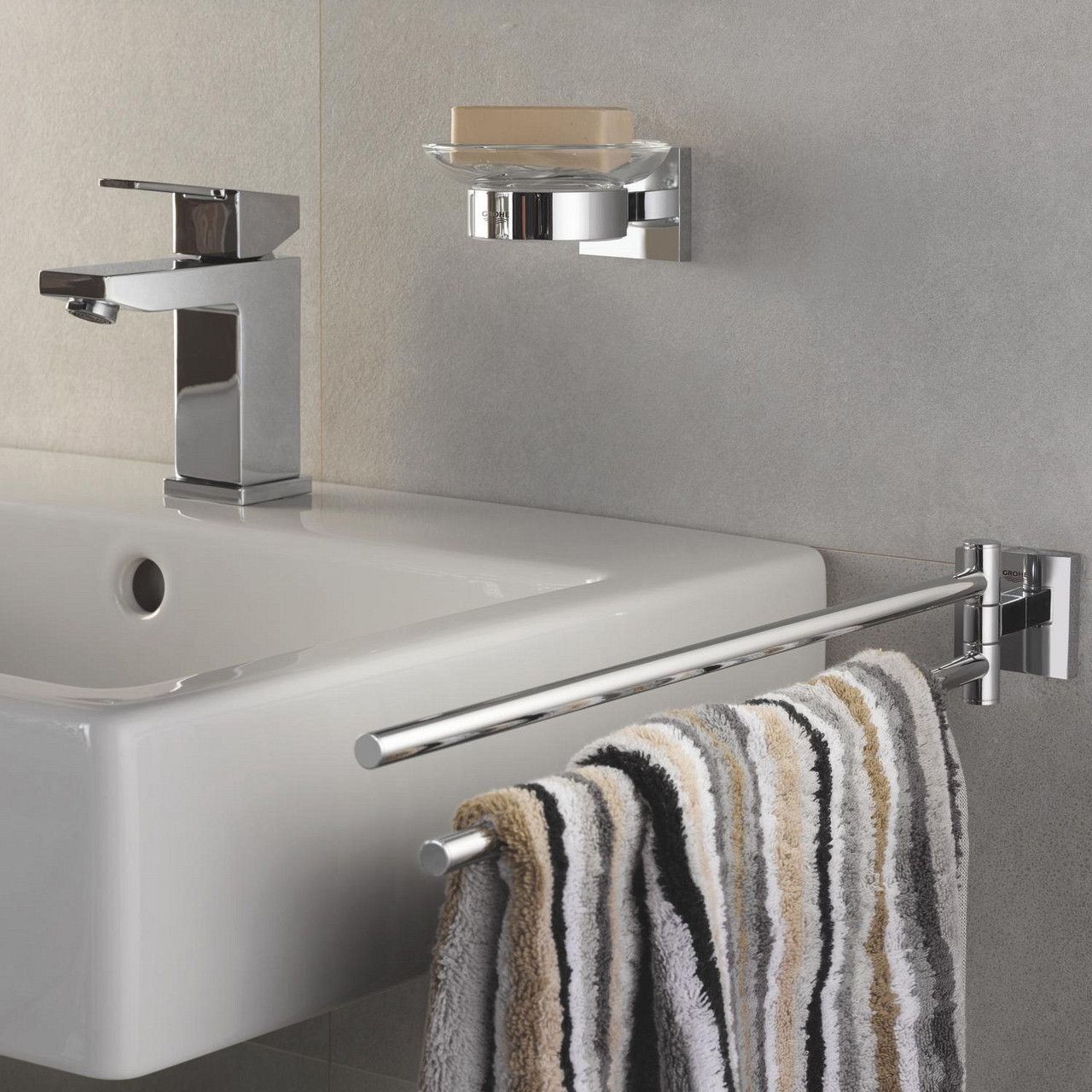 Доповніть дизайн вашої ванної кімнати та поліпште її функціональність з мильницею з тримачем Grohe QuickFix Start Cube. Цей стильний аксесуар привнесе затишок і комфорт у вашу ванну, підкресливши ваш індивідуальний стиль.