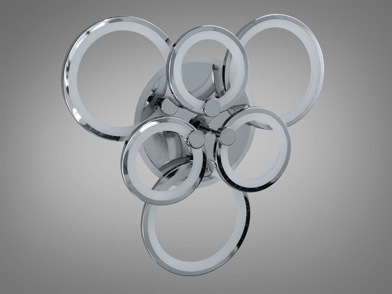 Інноваційне світлове рішення у стилі High-Tech, розроблене для основного освітлення кімнат площею до 20 м². Модель поєднує в собі футуристичний дизайн шести хромованих кілець, інтелектуальне керування та додаткове атмосферне підсвічування основи (синій, червоний, бузковий кольори).