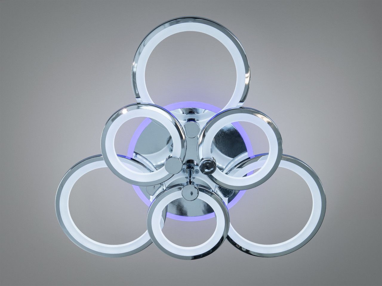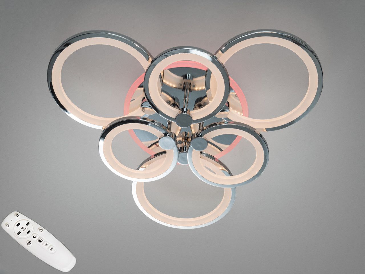 Люстра складається з шести концентричних кілець на дзеркальній хромованій основі. Головною особливістю моделі є вбудоване LED-підсвічування корпусу, яке працює у трьох статичних кольорах: насиченому синьому, енергійному червоному та лагідному бузковому. Ви можете вмикати кольоровий контур як окремо (у режимі нічника), так і разом із основним білим світлом, що створює ефект глибини та візуально «відриває» люстру від стелі.
