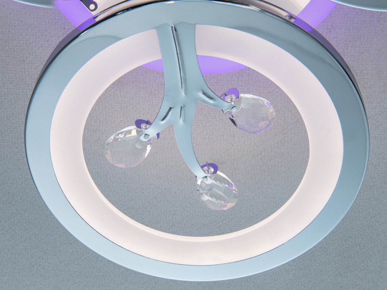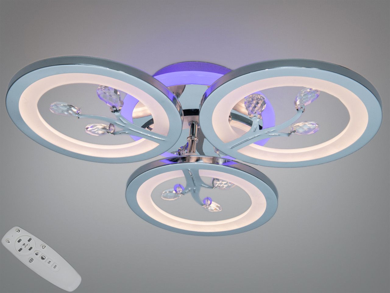 Додатковий LED-контур на основі може світитися синім, червоним або бузковим кольором. Ви можете вмикати його окремо за допомогою пульта ДК, що дуже зручно для використання люстри як нічного підсвічування.