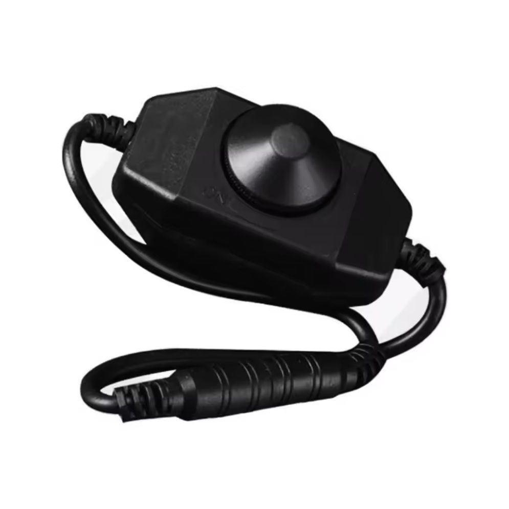 Це компактний контролер для плавного регулювання яскравості світлодіодних пристроїв, що працюють від постійної напруги. Пристрій підключається безпосередньо між блоком живлення та світлодіодною стрічкою або іншим LED-обладнанням, дозволяючи зручно керувати інтенсивністю освітлення за допомогою поворотного регулятора та вбудованого перемикача живлення.