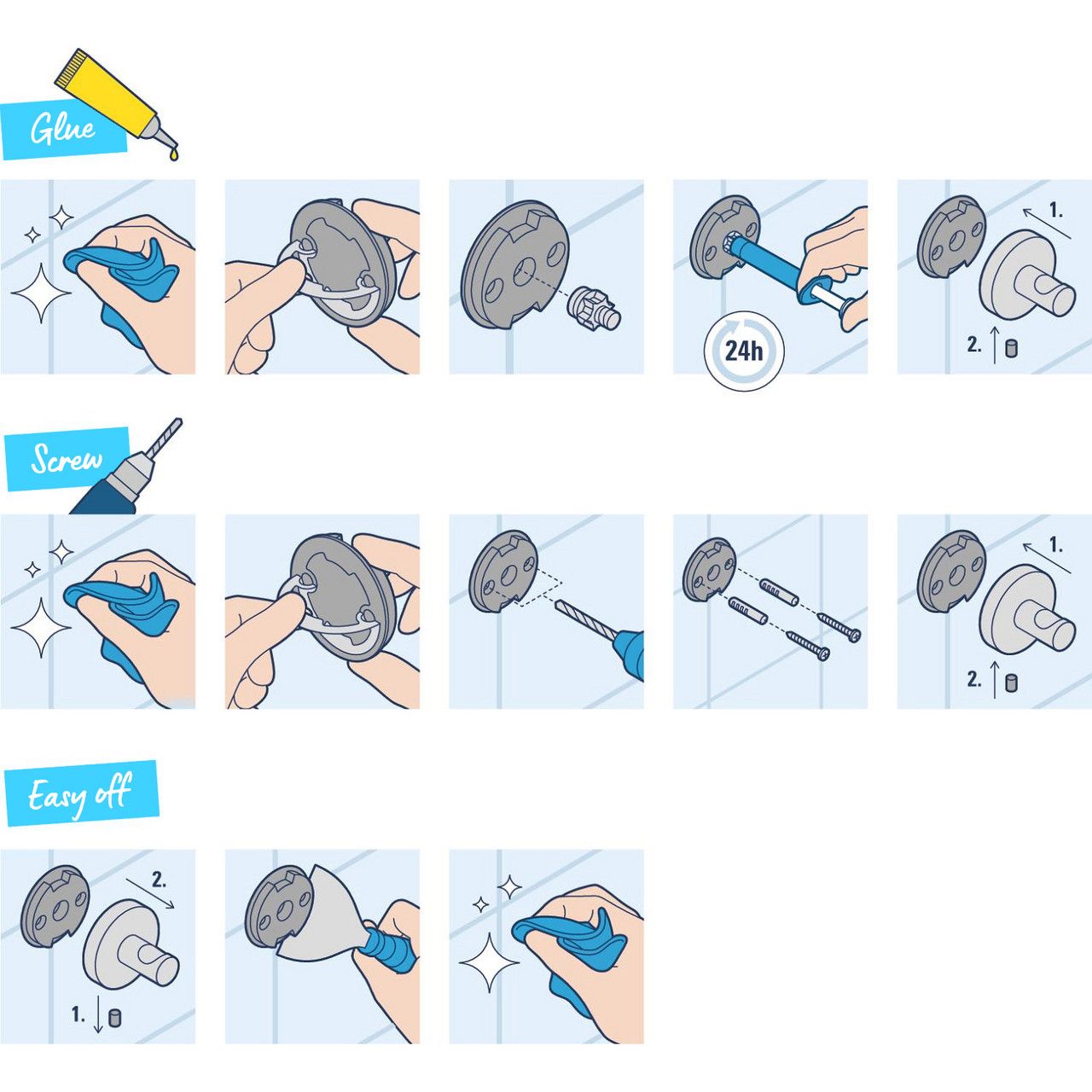 Прихований монтаж забезпечує естетичний та професійний вигляд у ванній кімнаті. Установити тримач можна двома способами: за допомогою гвинтів і дюбелів (йдуть у комплекті) або наклеїти за допомогою клею GROHE QuickGlue A2 (продається окремо). Для зручності також передбачена запасна монтажна пластина (арт. 40 917 000).