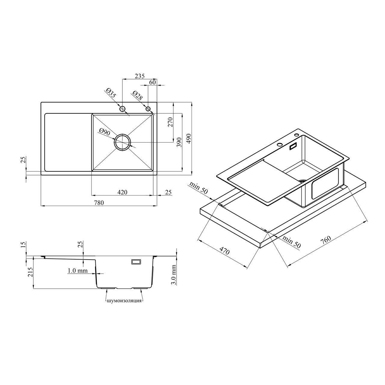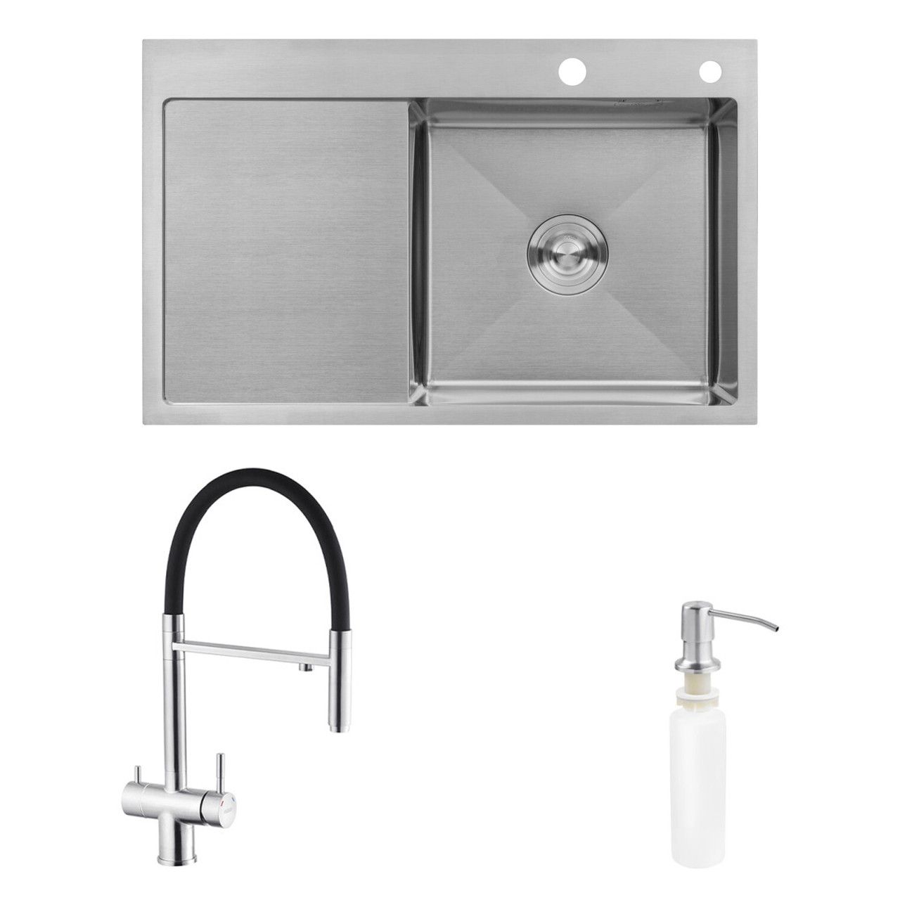 Комплект кухонна мийка Kroner Gebürstet-7849RHM + змішувач Edelstahl Klassisch-ESG03815BLK+ дозатор Spender-016