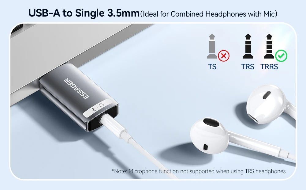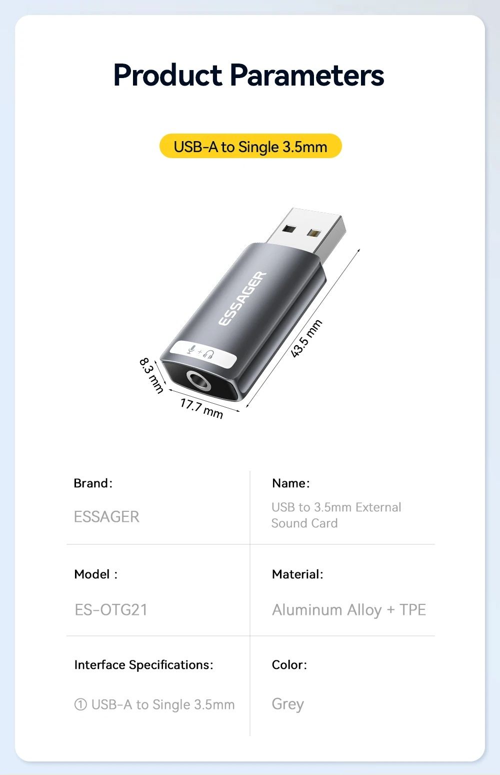 Зовнішня звукова карта Essager USB to 3.5 mm Jack (1×TRRS) – це компактний та універсальний аудіоадаптер, призначений для підключення навушників, гарнітури або мікрофона до пристроїв, які оснащені USB-портом. Аксесуар дозволяє швидко додати аудіороз'єм 3.5 мм на комп'ютери, ноутбуки, ігрові консолі та інші пристрої, забезпечуючи стабільне та якісне відтворення звуку.