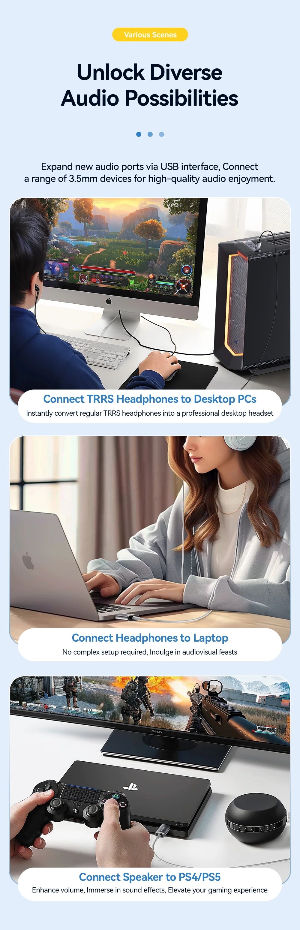Модель оснащена сучасним аудіочипом обробки сигналу, що забезпечує високу чіткість звучання, мінімальні затримки та стабільну передачу голосу під час дзвінків, ігор та онлайн-конференцій. Завдяки підтримці комбінованого роз'єму TRRS цей адаптер одночасно працює з навушниками та мікрофоном через один 3.5 мм порт, що робить його зручним рішенням для гарнітур.